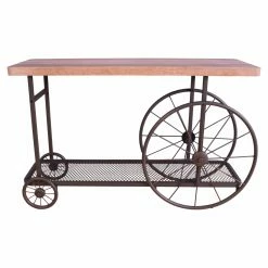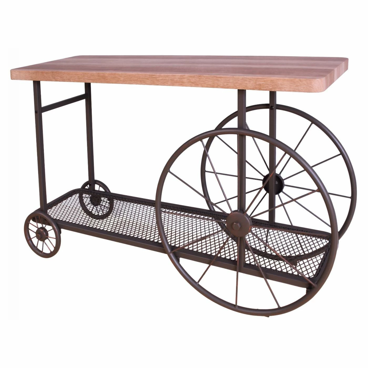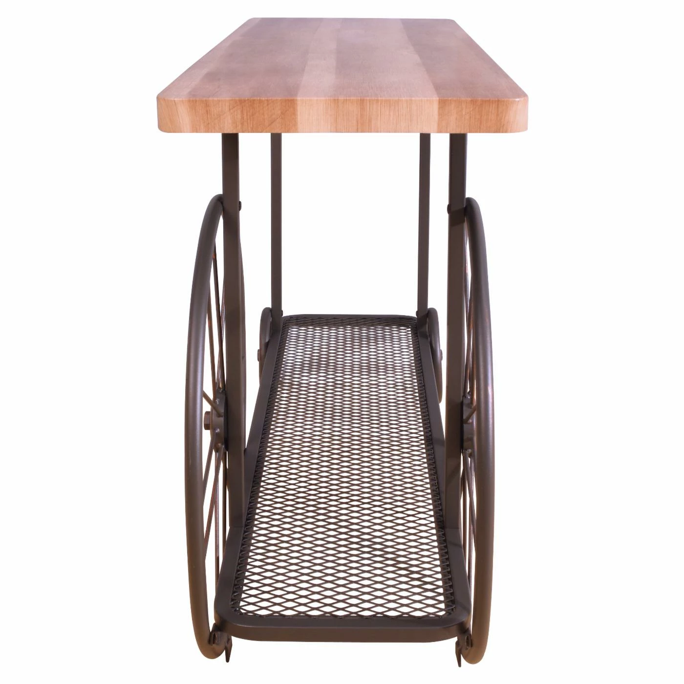 Rustically designed with an industrial-inspired silhouette, the ACME Francie Sofa Table provides stylish storage to your space. Featuring a black metal frame, lower mesh shelf, and natural-finished, wood butcher block top, this sofa table makes quite an eye-catching statement. Large wheels in the back and smaller ones in the front add mobility and even more visual appeal to this accent piece that’s functional and trendy.