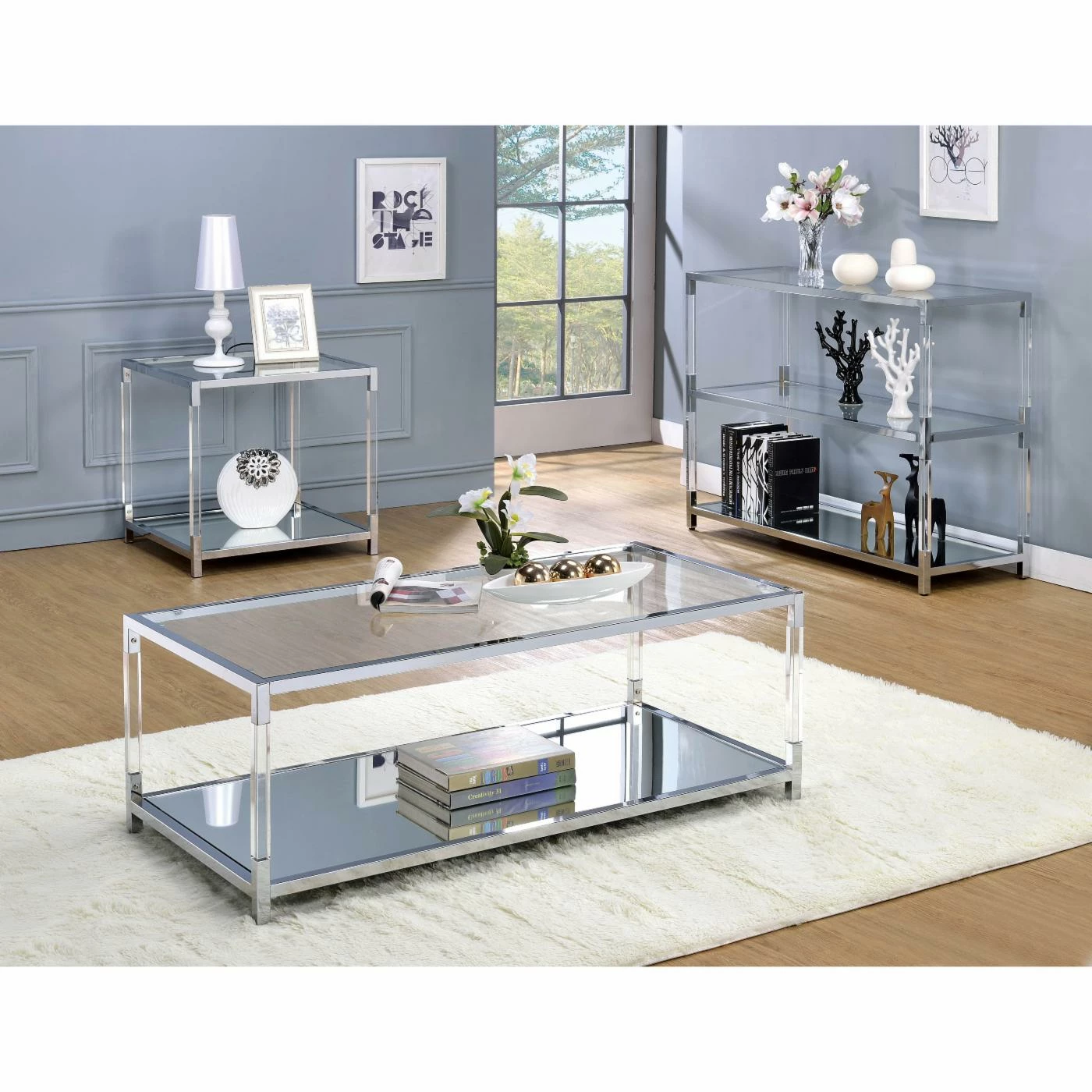 A dazzling mix of materials gives the Furniture of America Zoe Faux Lucite Console Table its sleek modern appeal. This console table is scaled slim and wide, making it a welcome addition to your foyer, hall, or behind the sofa. It features a tempered clear glass top, matching glass shelf, and a lower mirrored shelf that reflects whatever you choose to display. The metal framework has a chrome finish and clear Lucite segments.