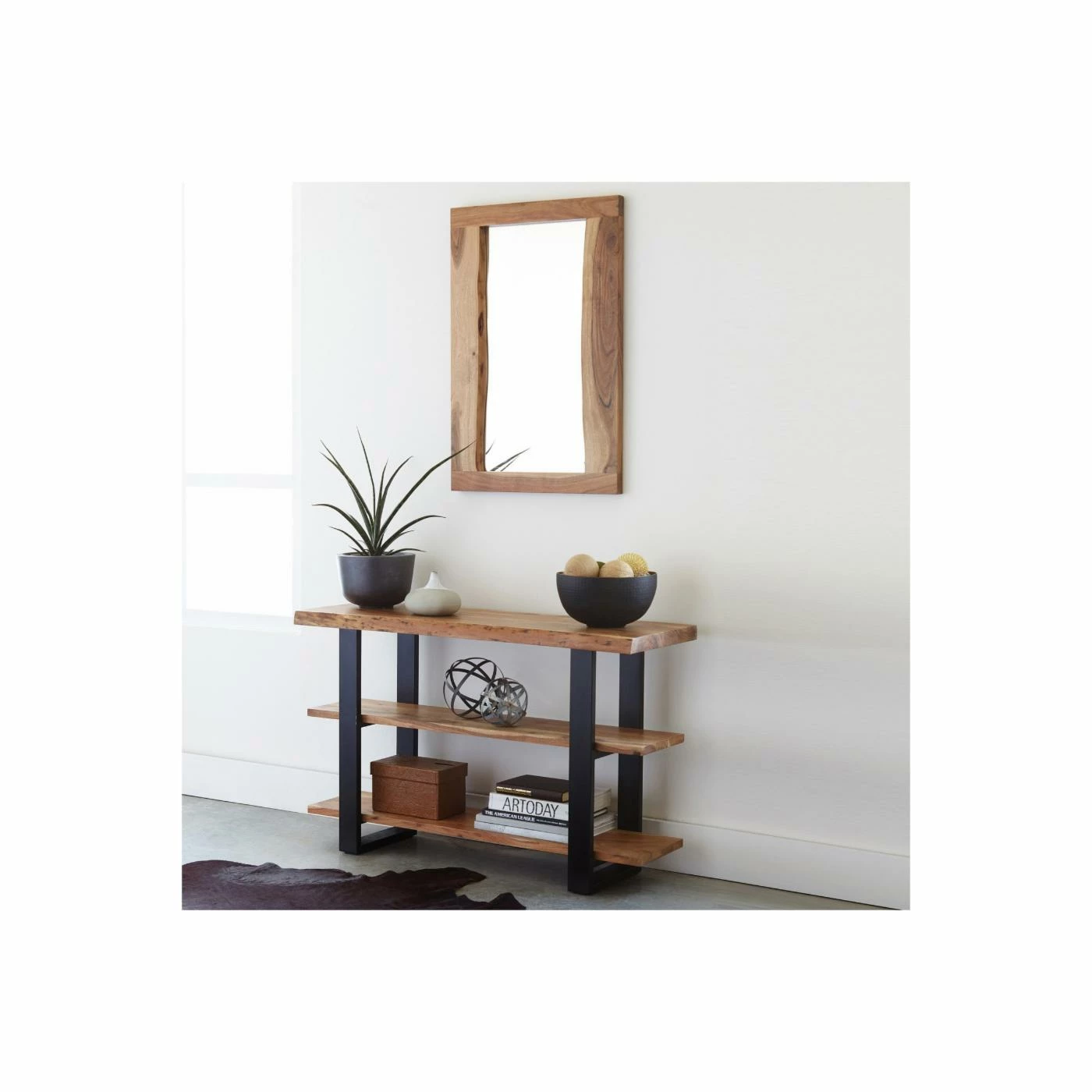 Alpine is gorgeous natural Acacia wood with live edge and metal strap legs; an industrial modern update for your living room. Each tabletop is unique; no two tops will be exactly alike. Constructed of natural acacia wood. Each of our live edge products includes nylon floor protectors. The knots and cracks add to the wood’s character. A clear natural finish enhances the beautiful features in each piece of wood.