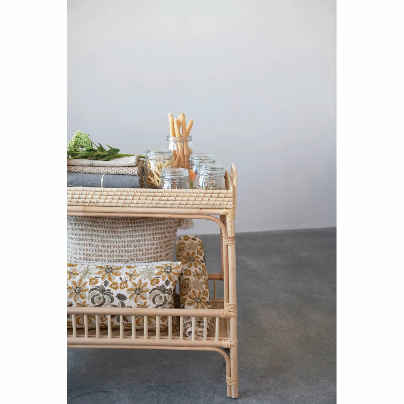 Add a hint of natural beauty to any dining space or entryway with this organically crafted console table. Made from rattan and bamboo. This modern boho console table showcases intricately hand-crafted rattan with a stylishly functional shelf. Perfect for a bohemian style space.