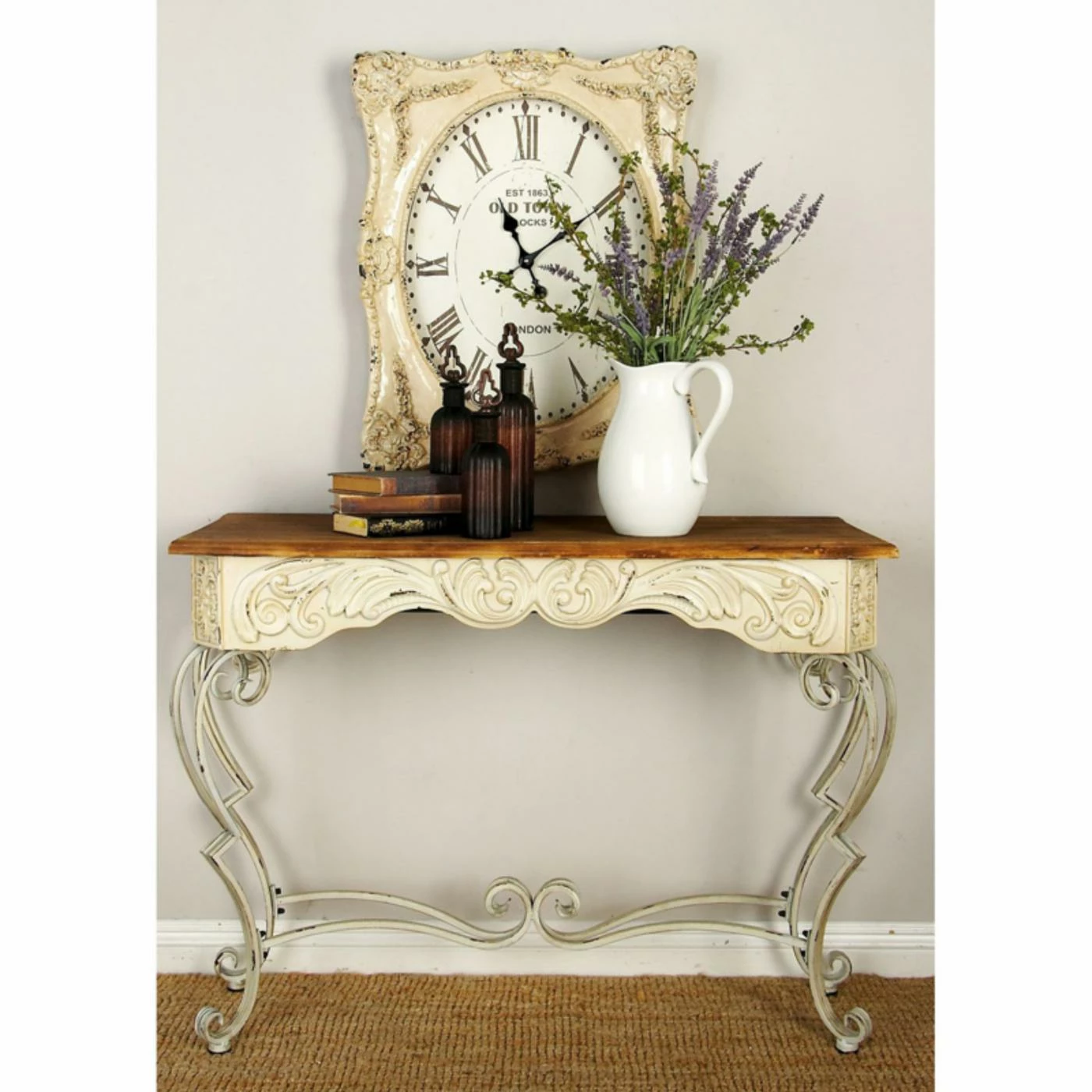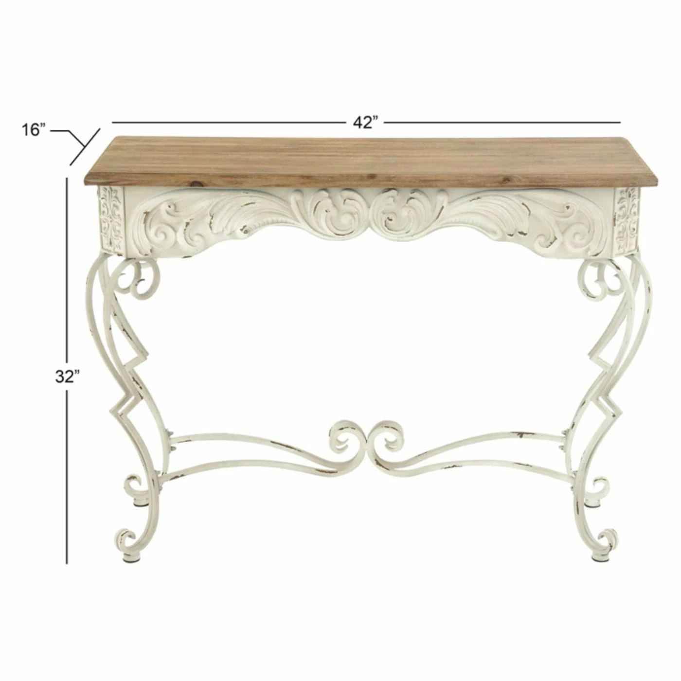 Intricate scrollwork enhances the traditional elegance of the DecMode 42 in. Metal Console Table. This beautiful console table showcases the natural beauty of the fir tabletop.