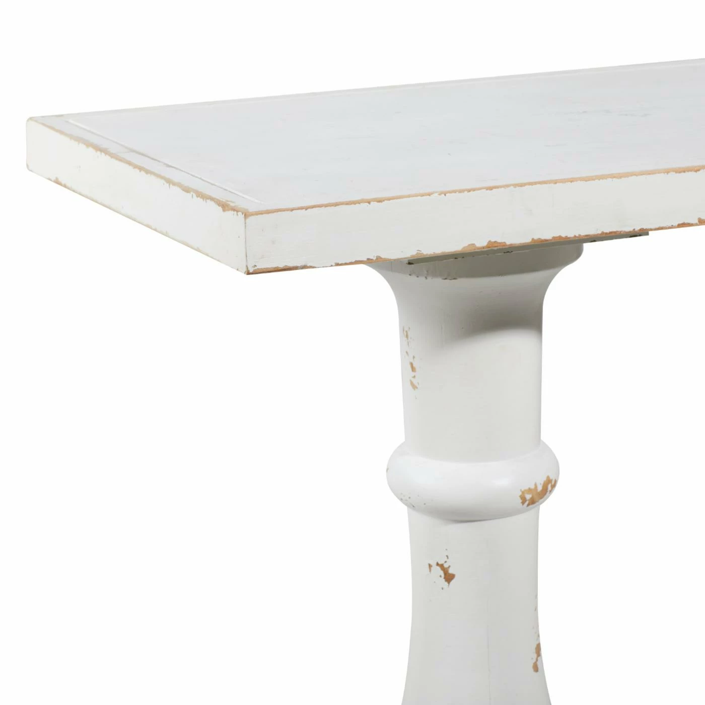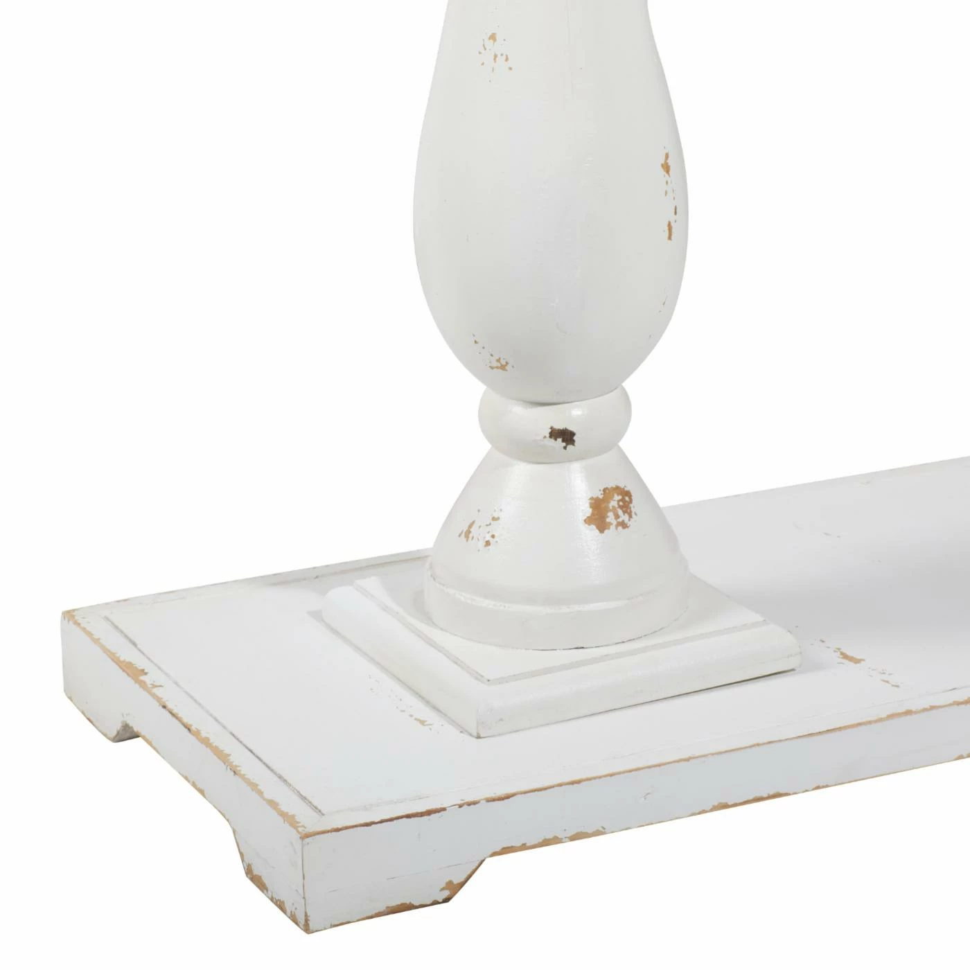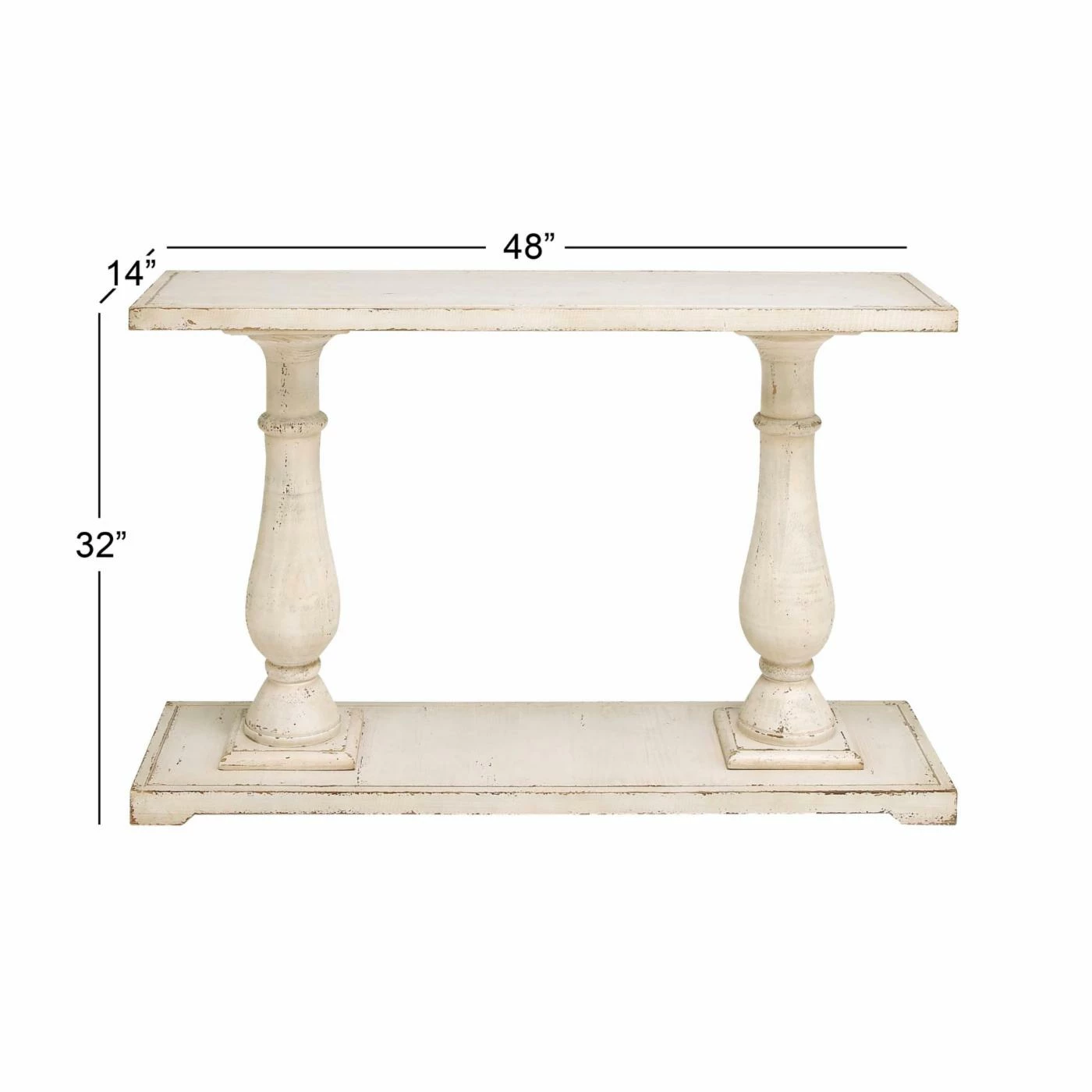 Add a bit of French country elegance to your entryway with the lightly distressed beauty of the DecMode 48 in. Wood Console Table. This sophisticated console table boasts a pair of blister legs and a sturdy platform base. It’s hand-made from Chinese fir wood with natural wood grain visible through the distressed eggshell white finish. The hand-carved turned legs are secured to a horizontal support slat on the bottom for additional sturdiness.