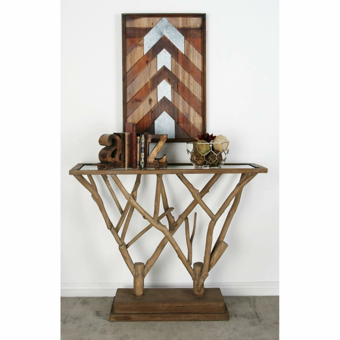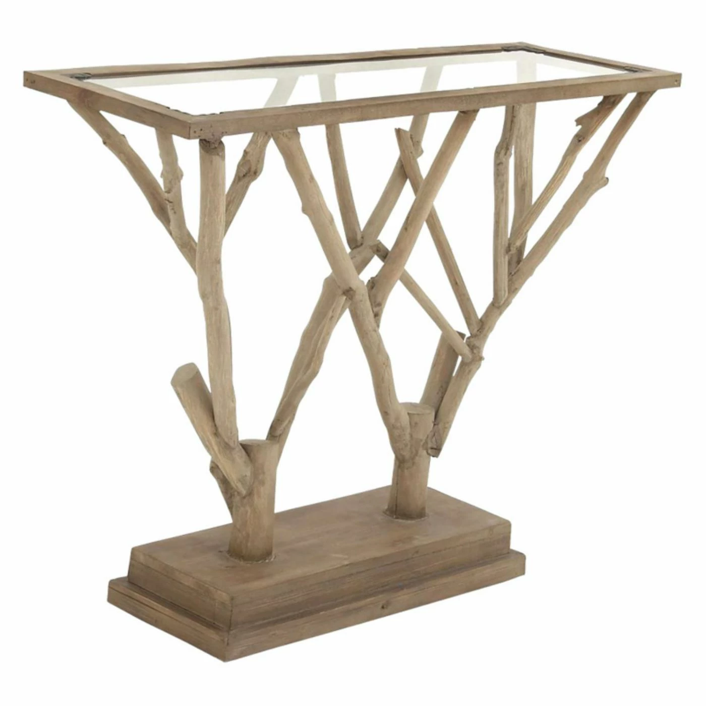 The DecMode Organic Wood Branch Console Table makes a beautiful capstone to your reclaimed or natural-themed room design. This console table is a wonderful place to put your favorite pieces on display with a wide, clear glass table top. The frame of the piece is built from tough hardwood and fir wood with a stepped rectangular base and intertwining branchwork that supports the top. The wood has a natural finish to retain its inherent allure.