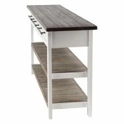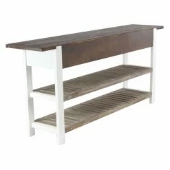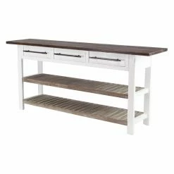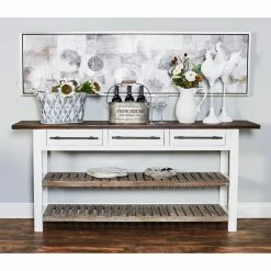 Update your decorative scheme with the DecMode Traditional 3-Drawer Wooden Console Table that exudes rustic style. This table features a sturdy wood construction and boasts a distinctive brown and white finish thatβs easy to pair with most decorative schemes. It boasts two shelves and three drawers to enhance household organization.