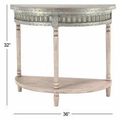 Farmhouse details make the DecMode Traditional Fir Wood and Iron Half-Round Console Table a rustic accent for your home. This console table features an iron tabletop with gray galvanized and gold finishes. The base is constructed of fir wood with turned legs and a lower shelf in a distressed blush pink finish. The flat back will situate perfectly against a wall in your entryway or against the back of your sofa.