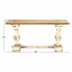 Complete your dΓ©cor with some shabby chic flair, compliments of the DecMode Wooden Rectangle Console Table. Fabricated out of fir wood, the paneled top has a warm brown finish with natural wood grain. Its hand-embellished pedestal legs and horizontal stretcher are coated in distressed eggshell white for contrast. Engineered wood, also known as MDF or medium density fiberboard, combines with fiberglass in the legs to create a warp-proof structural support for the tabletop.