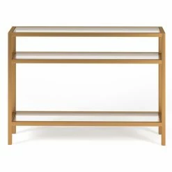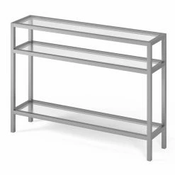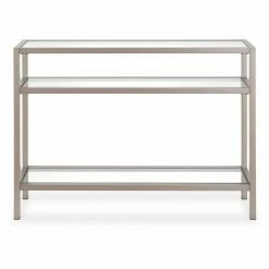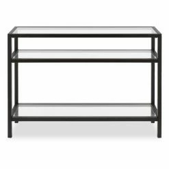 Keep your living room looking tidy and organized with just a little help from the Hudson & Canal Sivil Console Table. This wide console table is crafted from tubed steel with hardy block legs. The wide top lends plenty of space for a decorative arrangement while the shelf beneath provides space for storage boxes and smaller items. A base shelf is ideal for tall vases, pots, and more. Each of the shelf surfaces is built from clear tempered glass. A matte black tops the frame.
