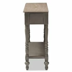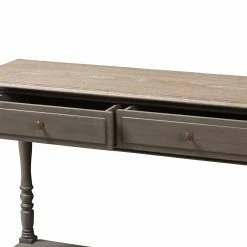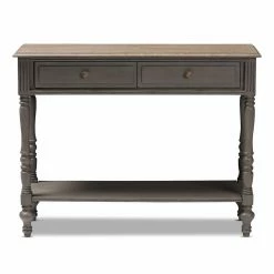 The HumbleNest Woods Farmhouse / Cottage 2 Drawer Cottage Console Table boasts romantic elements in its country cottage aesthetic. This wooden console table boasts an ornate ball-turned leg design, as well as dark bronze drawer pulls. Two drawers and a bottom shelf offer ample storage and display space. A neutral gray finish completes this console table.