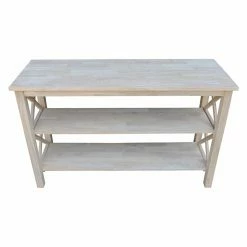This versatile International Concepts Hampton Console Table features casual X sides, offers two lower shelves, plus is scaled to fit behind your sofa or in the hall. It’s built from solid wood with the available finish options.