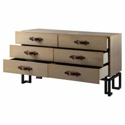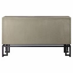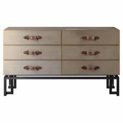 Antique steamer trunks and contemporary minimalism serve as the inspiration for the Acme Furniture Jennavieve Console Table. The gold-toned aluminum console features six drawers with rivet details and faux leather strap handles. A sturdy dark brown iron base supports the console table.