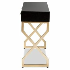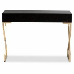 Add a touch of modern style to your home with the Baxton Studio Carville Upholstered 2 Drawer Console Table. The metal legs are in an interesting, X-shaped pattern and gold finish. Two drawers provide ample storage, and the table top is made of engineered wood and upholstered in faux leather. The rich, dark brown of the faux leather contrasts nicely with the gold metal accents. Use this console table in your entryway to greet guests, or use it as a desk. Some assembly required.
