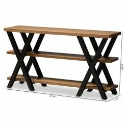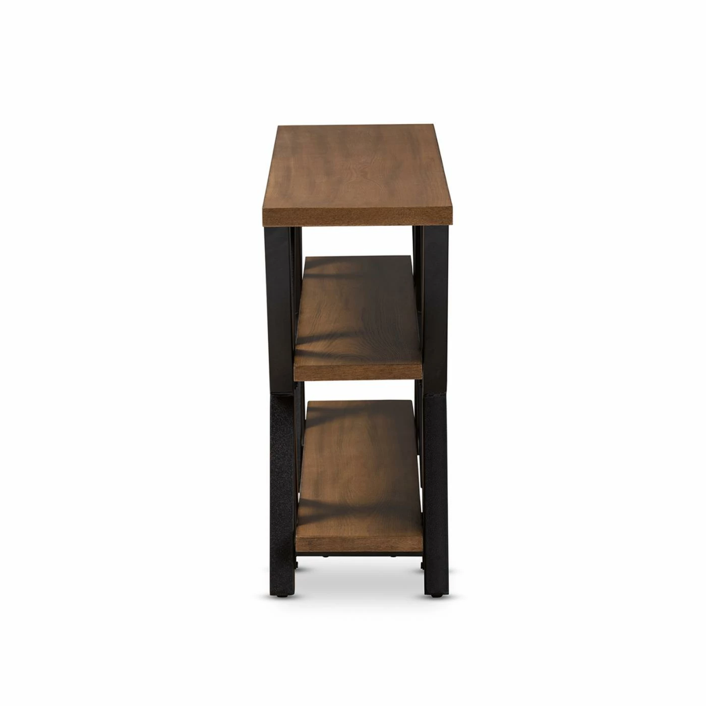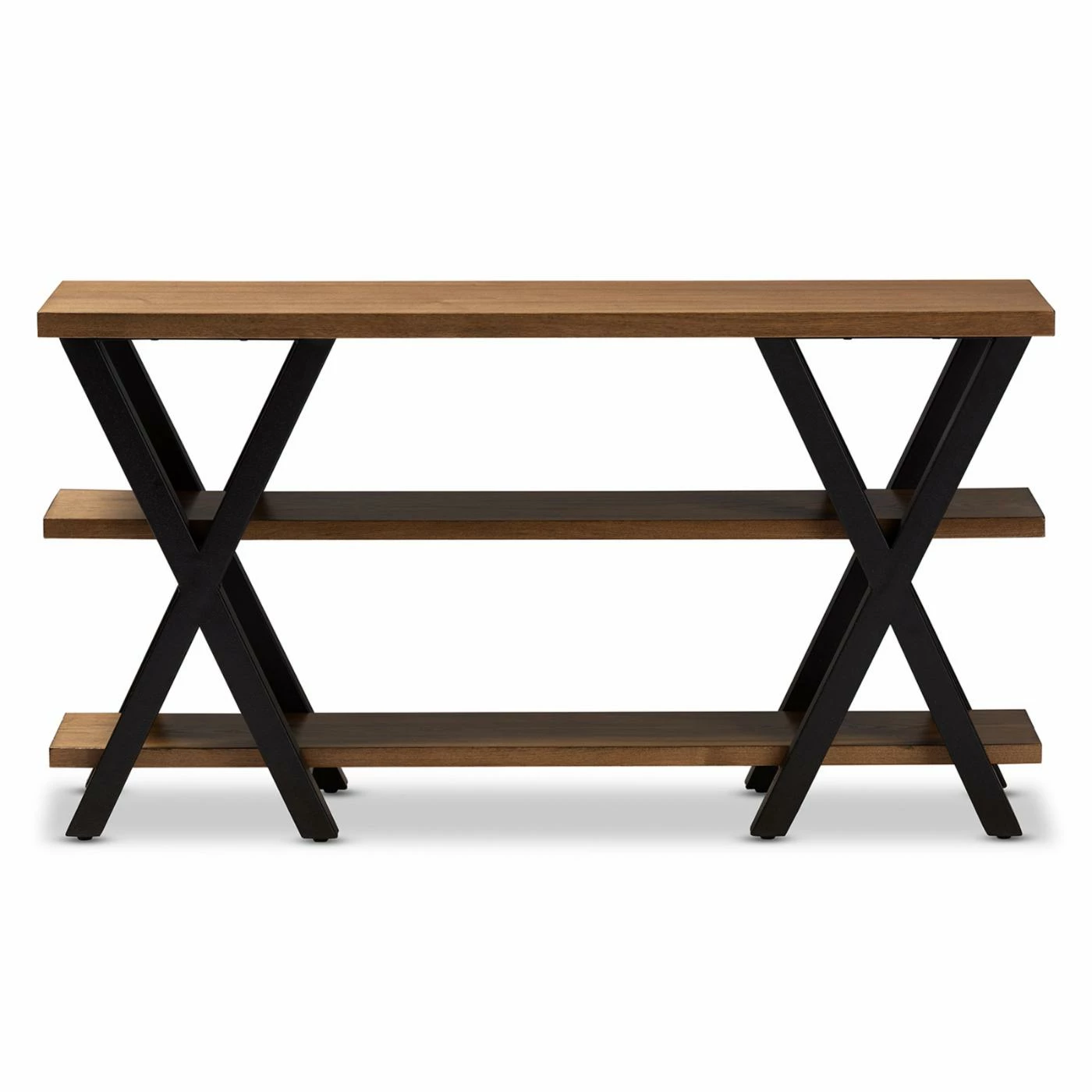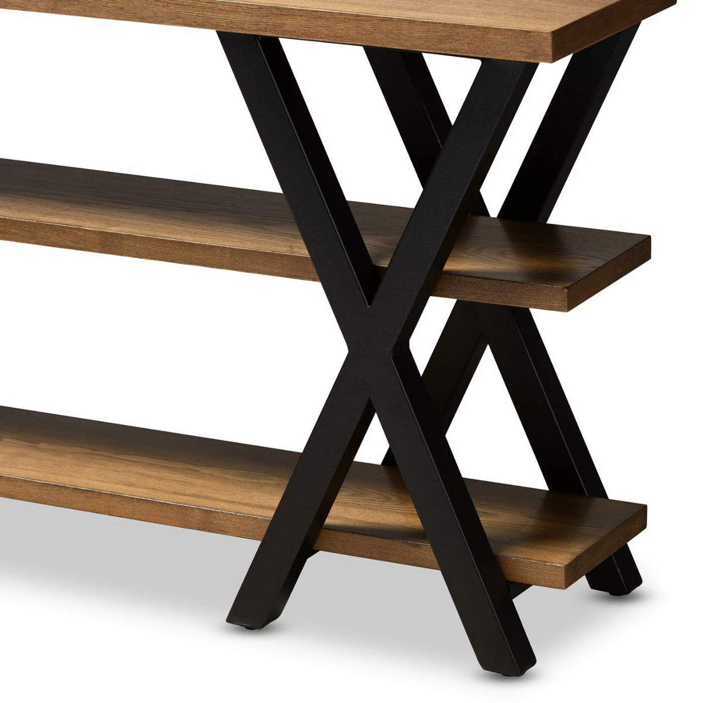 Complete with two lower shelves and a tabletop, the Baxton Studio Duchaine Industrial Console Table offers ample storage for all of your consoles and decor. The criss cross frame is crafted from metal and finished in a rich black color, giving this console table an industrial feel. Made from sturdy engineered wood, the shelves and tabletop boast a natural brown oak color for a touch of classic style.