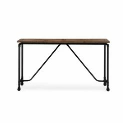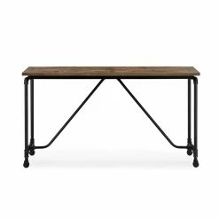 Adorn your foyer or hallway with the Burnham Home Designs Cornelia Console Table that features a bold industrial aesthetic with its steel pipe design. This console table features a stainless steel base that supports a solid wood top. The top features a rustic natural finish, a strong contrast to the base’s black hue. Perched on four casters, this table is convenient to move in and out of place as needed.