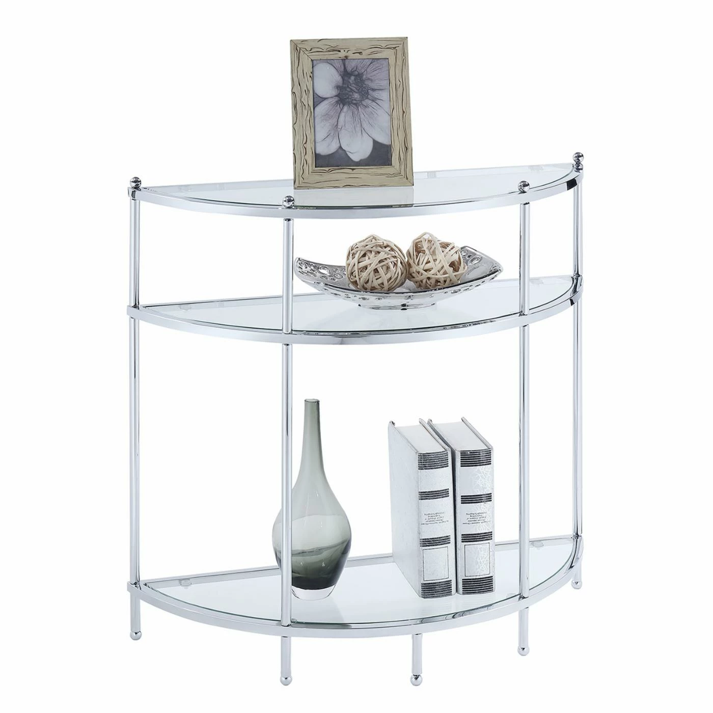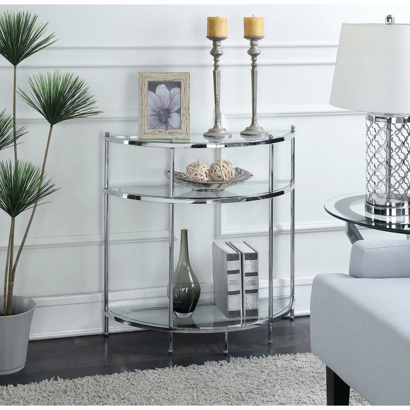 Keep your dΓ©cor elegant, simple, and modern with the Convenience Concepts Royal Crest Entryway Table. Perfect for displaying your favorite curios, plants, or pictures, this table gives you added storage space without detracting from your dΓ©cor. Its chrome frame is strong and durable while the three glass shelves highlight the beauty of your style.