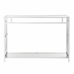 Turn that bare stretch of wall into a dazzling display space with the Convenience Concepts Town Square Console Table. This console table is an exciting modern update for your living room or hall. Its frame is built from squared metal and is topped by a polished chrome finish for a mirror-like shine. Open square details accent the apron and sides. Both the wide tabletop and matching lower shelf are crafted from thick, clear tempered glass.