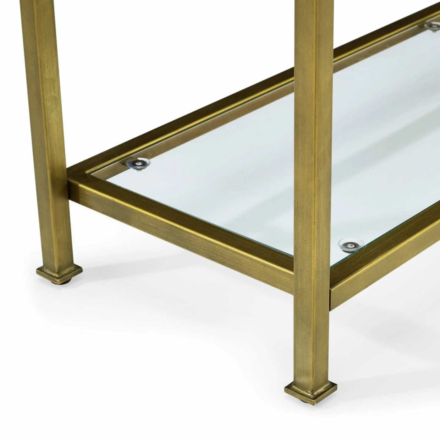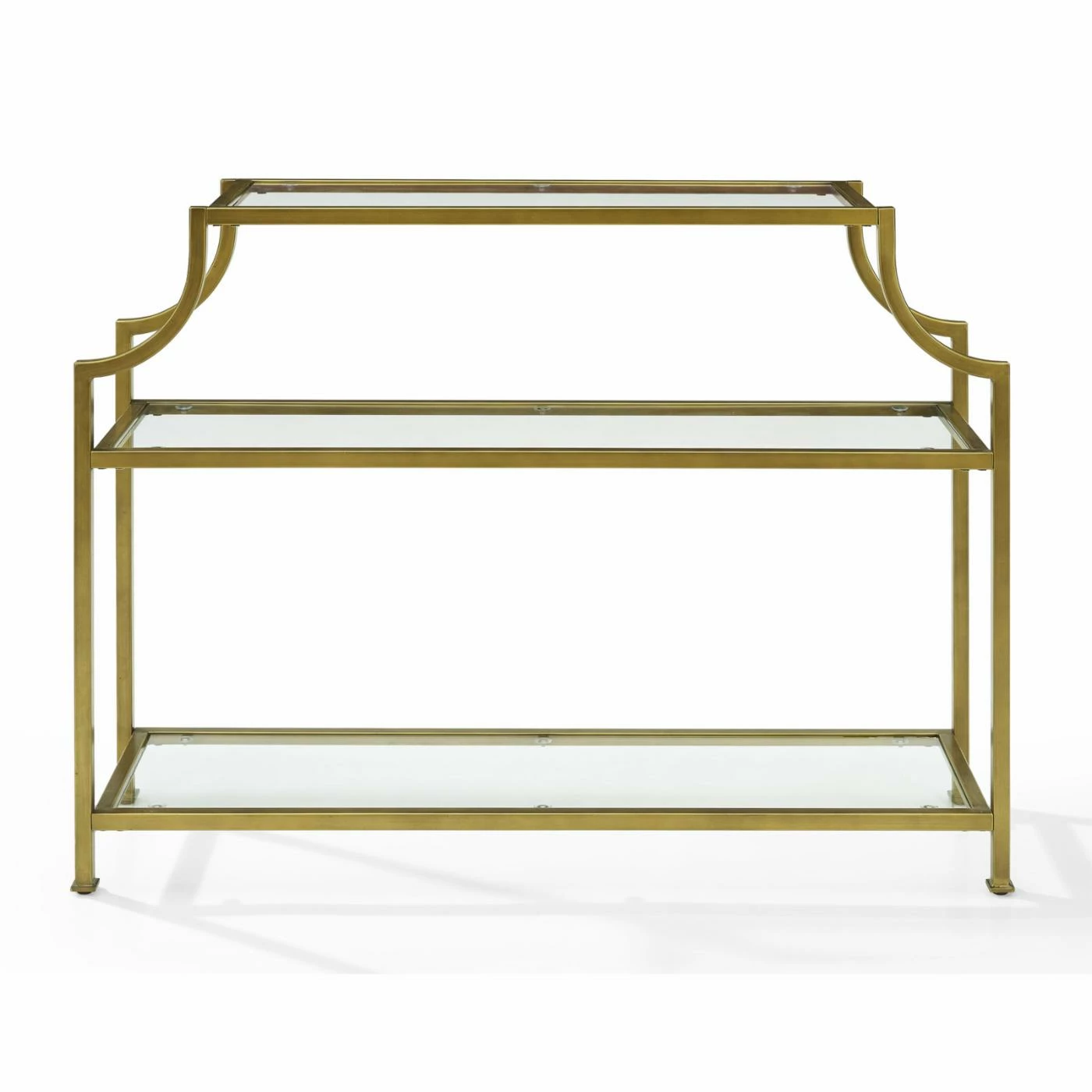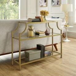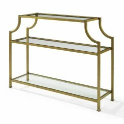 A notched top design and antique gold finish give the Crosley Aimee Glass Console Table its glamorous mid-century design. Style this console table in your entryway to set the style tone for your whole home. It’s openwork frame is built of steel and its glam gold finish is powder-coated for durability. Beveled tempered glass forms the top and two lower shelves of this console table.