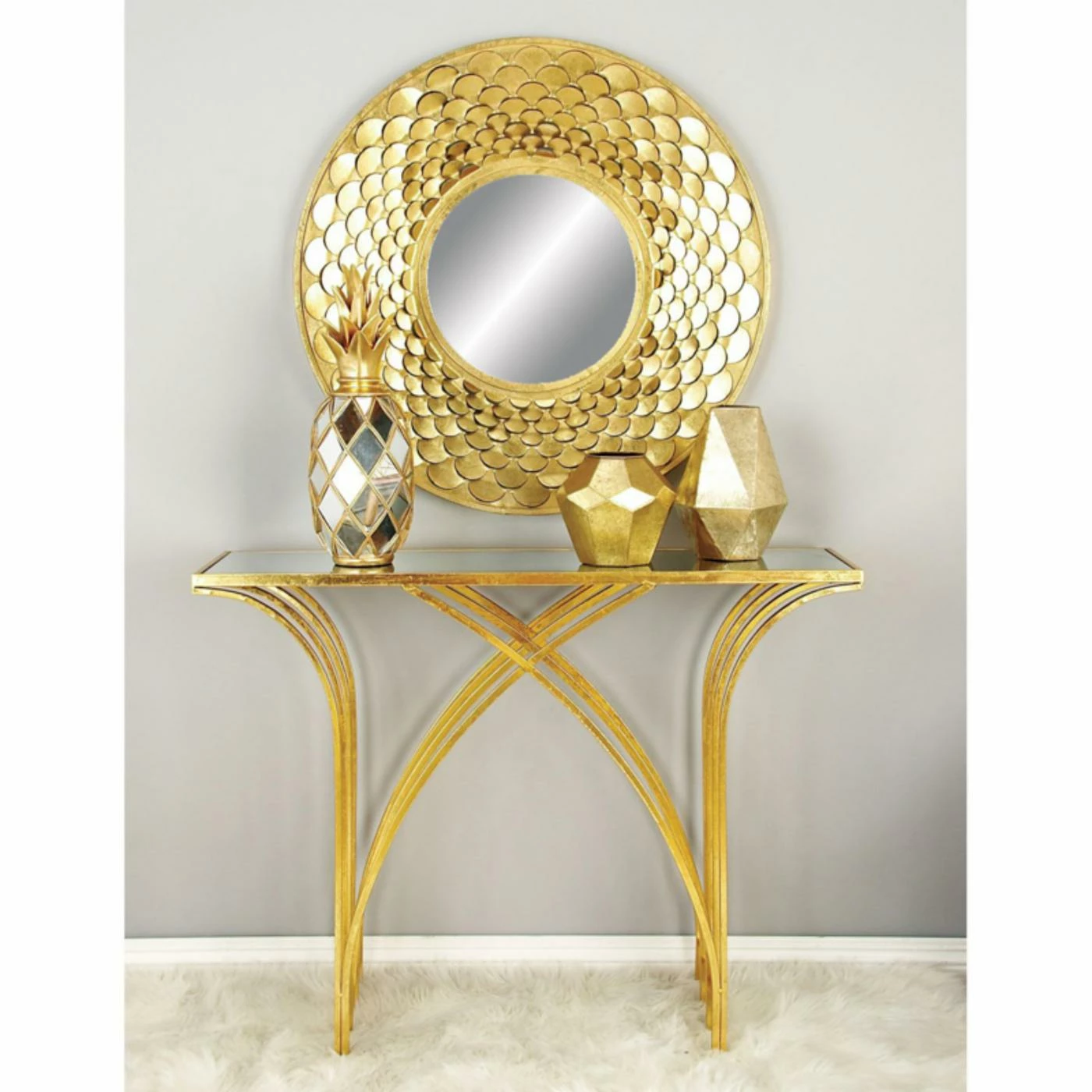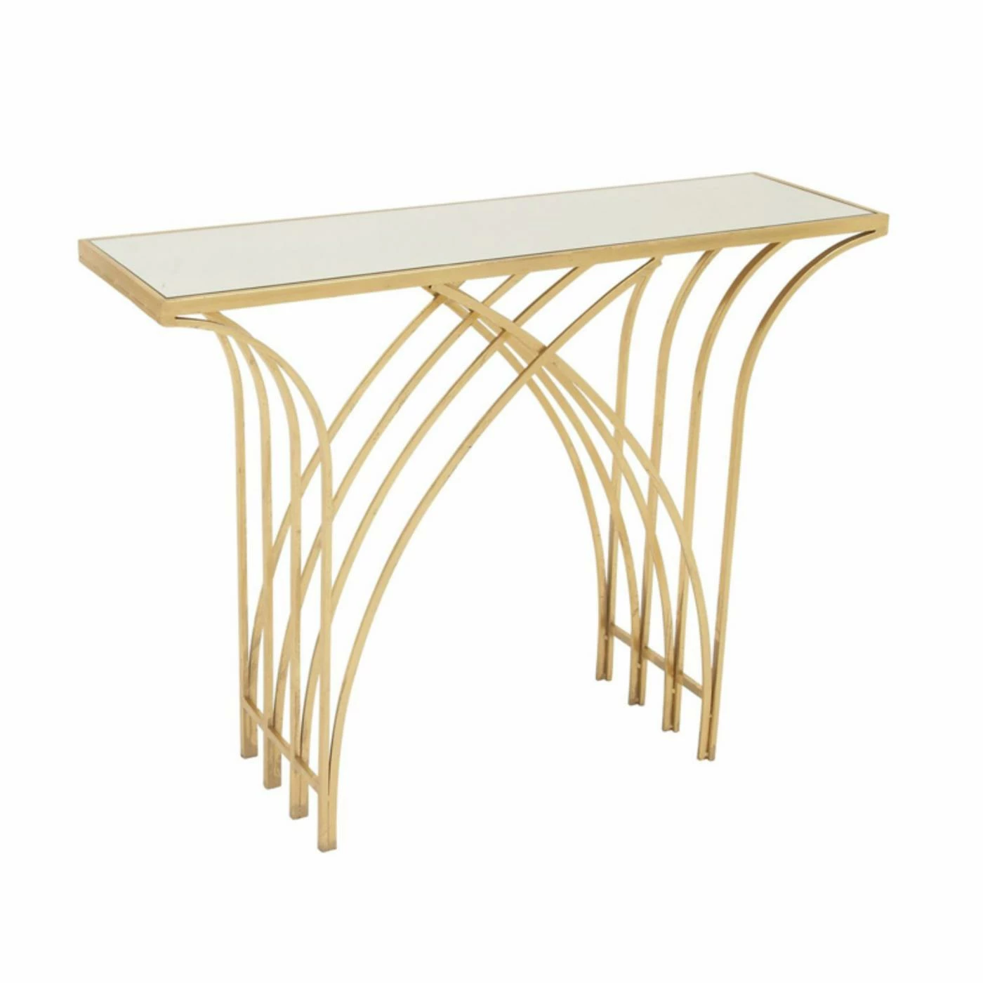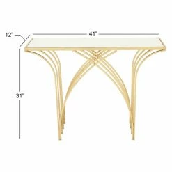 The shimmering gold finish and glass mirror top give the DecMode Glass Top Decorative Console Table – Gold its contemporary glamour. The base on this console table features a chic waterfall design.