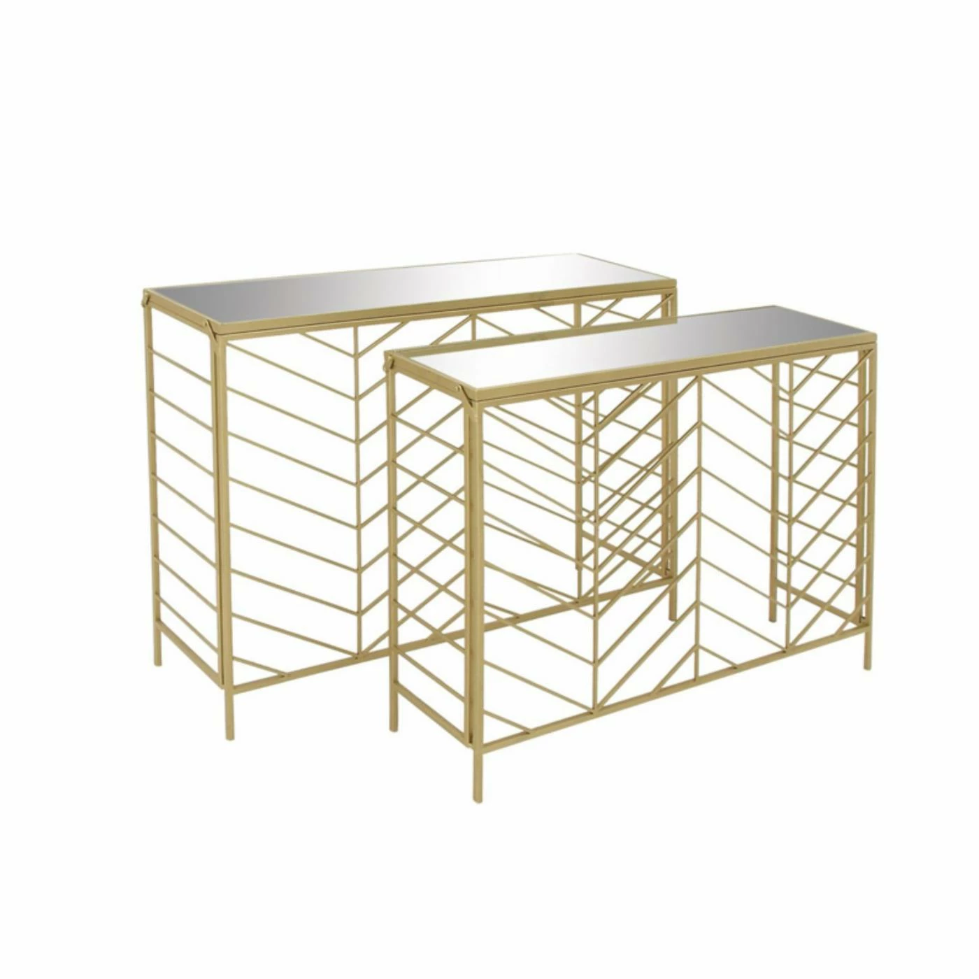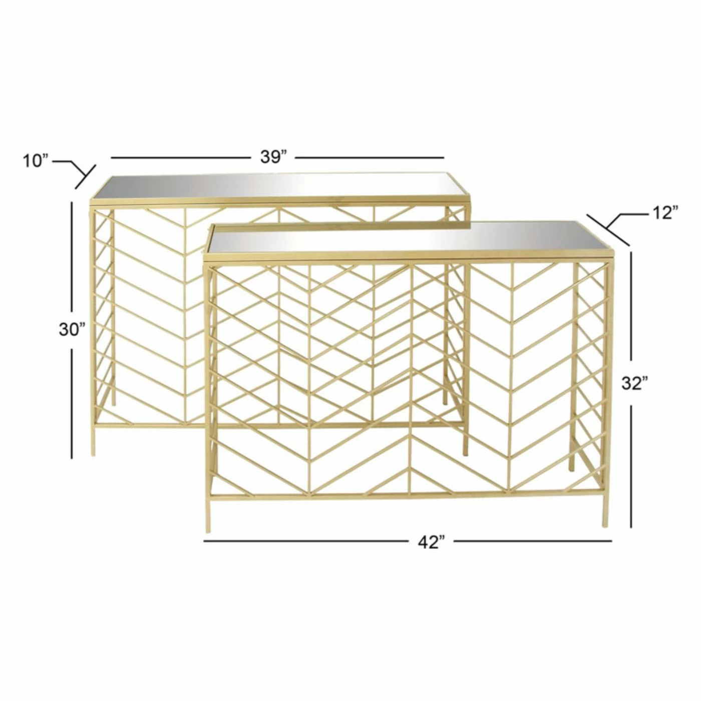 The open chevron pattern on the DecMode Mirror Top Gold Console Table – Set of 2 is drenched in a glamorous gold finish. The top of each console table is inset with polished glass mirrors. This set includes one large and one smaller console table.