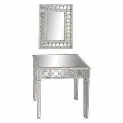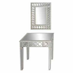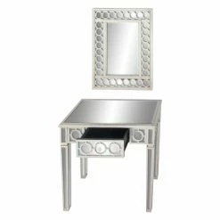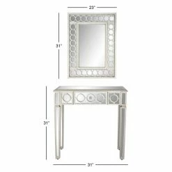 The DecMode Modern 2 Piece Wood and Glass Wall Mirror and Console Table Set offers contemporary accents for your space. This mirror and console table set features engineered wood and Chinese fir wood craftsmanship. Geometric designs adorn the mirror frame and console tabletop, while a single drawer adds convenient storage. This mirror and console table shine bright with a silver finish and mirror accents.
