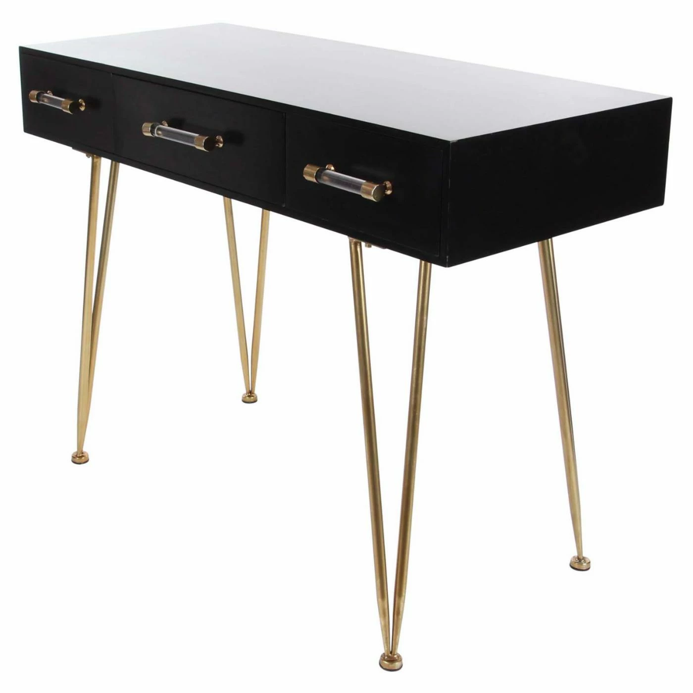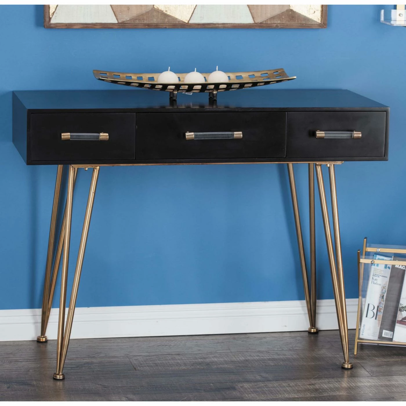 Patterned after mid-century modern furniture designs, the DecMode Modern Console Table will bring retro appeal to your seating area, hallway, or entryway. The table features a sturdy solid red pine wood top painted black to match any palette. Gold hairpin legs support the table and enhance its vintage aesthetic. For storage, the table features two drawers with clear acrylic rod handles.