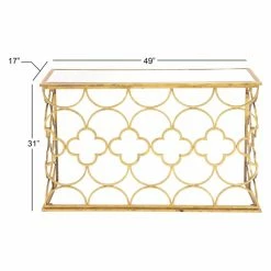 Bring a brilliant side accent to your living room with the DecMode Quatrefoil Console Table. This rectangular console table features an intricate base with a quatrefoil pattern, crafted from solid iron and finished in a glimmering gold color. The tabletop is made from a rectangular mirror, making it perfect for displaying a floral arrangement or decorative sculptures.