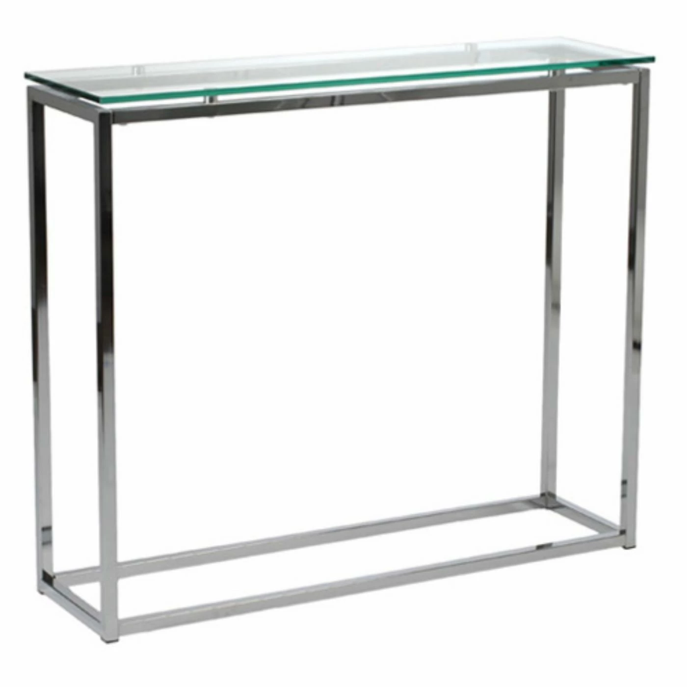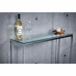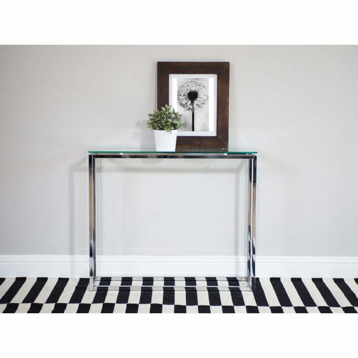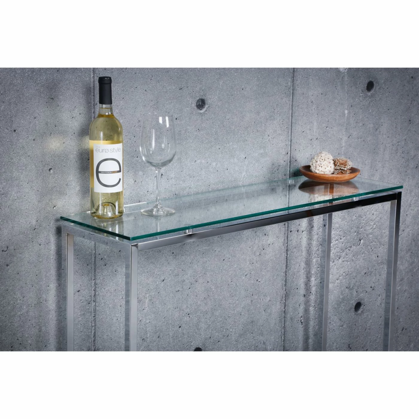 Make it the first thing guests see. With its simple, sleek lines, the Euro Style Sandor Console Table β Clear makes a breathtaking first impression in your entryway. It can also be divine on a landing, in a bedroom or home office, or to hold fresh flowers or tea service in the most miniscule of dining areas. Crisp chrome and glass complement any style of dΓ©cor.