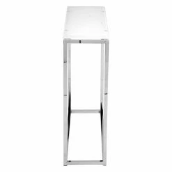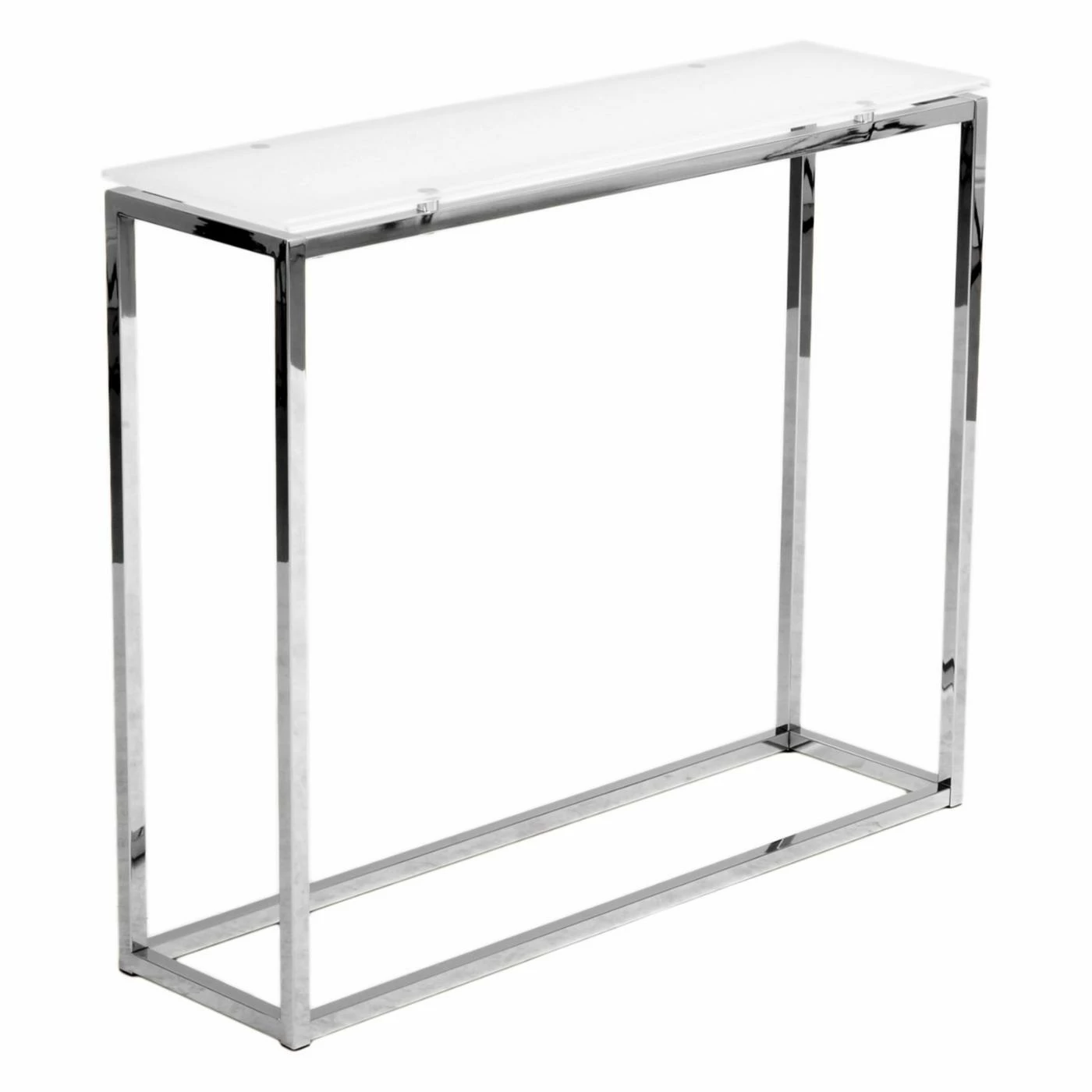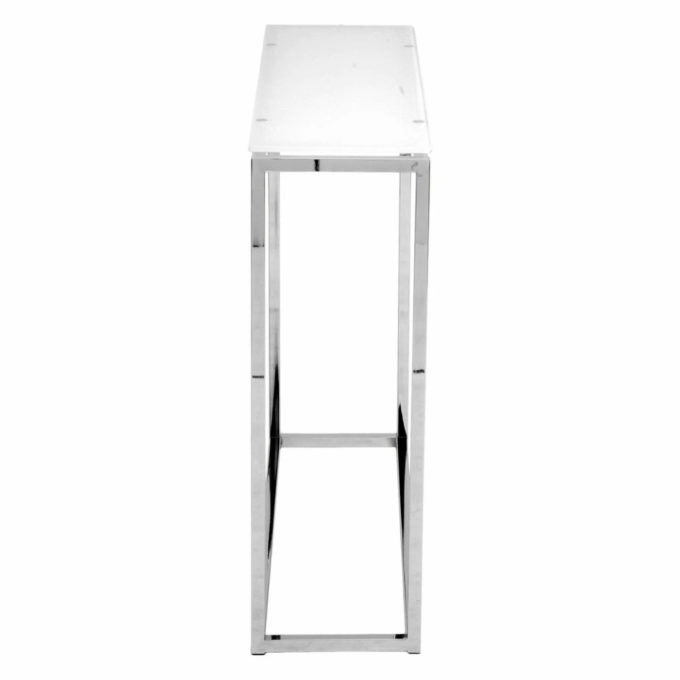 Modern design and function make a bold statement in the Euro Style Sandor Console Table. The chromed steel base offers geometric chic in its sturdy design that supports a thick white tempered glass top. Equally suitable for the home or the office, this piece will gleam in a contemporary setting.