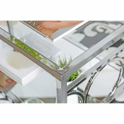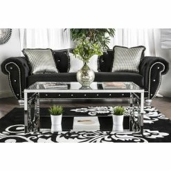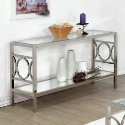Stellar craftsmanship is evident in this Furniture of America Nadya Circle Accented Sofa Table. Supported by a metal frame and featuring a tempered glass tabletop, it’s offered in your choice of available finish. It also is equipped with an open mirror shelf so you can display decorations or keep magazines and books in order.