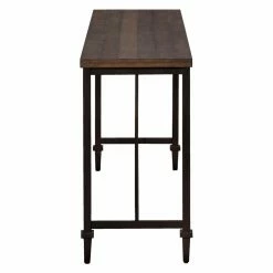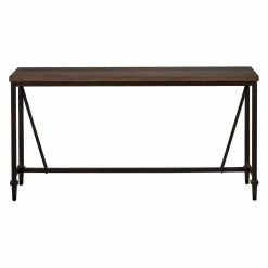 Grant your favorite decorative items a prominent perch in your living room with the Hillsdale Furniture Trevino Sofa Table. This tall and wide sofa table has a spacious top for flowers, pictures, curios, and much more. The top is made from a solid piece of wood and finished in a rich walnut brown. The base comes crafted from squared tube-metal and is finished in a complementary copper brown. An I-shaped stretcher and diagonal braces provide support and some extra visual flair.