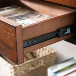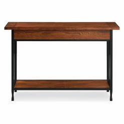 Sure to be your next where’d you get that? piece, the Leick Home Ironcraft Sofa Table features slatted sides inspired by Mission style. The slats along with the frame are crafted of blackened steel, which complements the burnished medium oak finish on the hardwood solids and oak veneers. Two drawers with full-extension ball-bearing glides pair with a lower display shelf to offer handy storage, whether you place this table behind the sofa, in a hallway, or even an entryway.