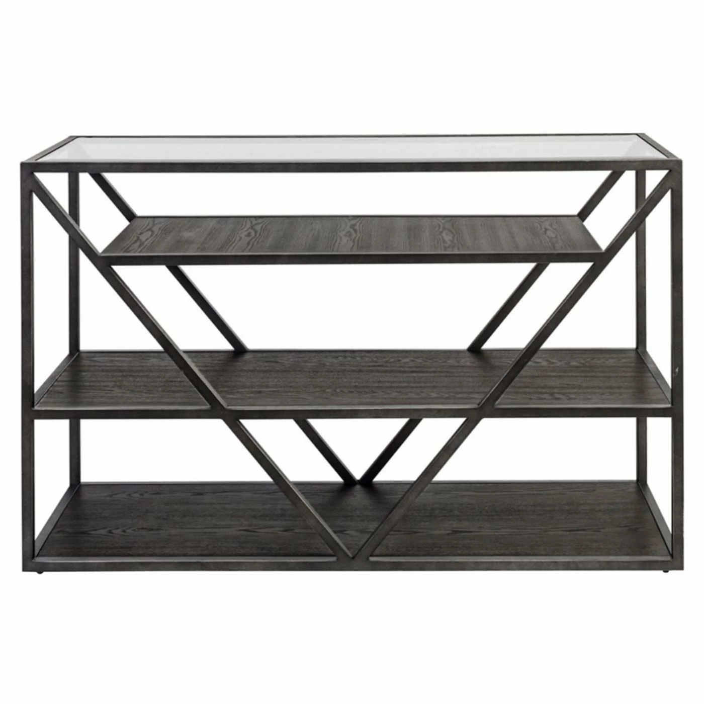 Add chic industrial flair to your home with the Liberty Furniture Industries Arista Sofa Table. This sofa table is made for stashing books and magazines on its ample shelving, or for resting your beverage on its tabletop as you lounge on the couch. Its V-shaped trestle frame is built from sturdy metal in an aged pewter finish and lends an intriguing angular geometry to the piece. Its three ash gray wooden shelves are complemented by a transparent beveled glass tabletop for an added touch of sophistication.