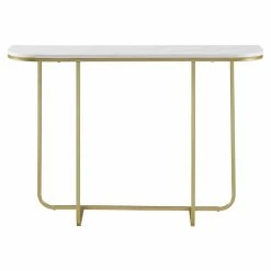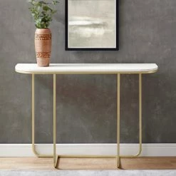 Keep all your daily necessities waiting for you as you step out the door with the Manor Park Modern Curved White Faux Marble Entry Table. This entryway table has a flush-to-wall design that keeps it out of the way. The base is made from squared metal with curved legs and a polished gold finish. Thick engineered wood constructs the table surface, overlaid with white faux marble.