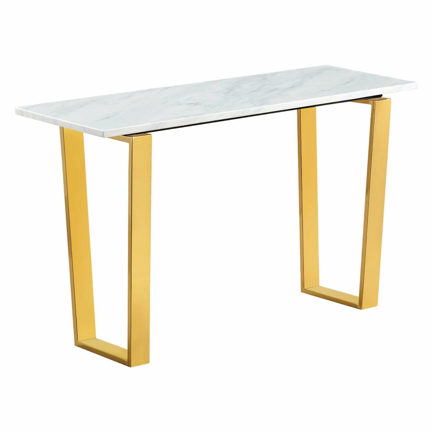 The tall, slim, and wide Meridian Furniture Inc Cameron Gold Console Table is perfectly scaled to suit your entryway, hall, or behind the sofa. This console table is graced by a genuine white marble slab perched atop a rich gold stainless steel leg base. Pair it with other Cameron occasional tables for a cohesive design throughout your home.
