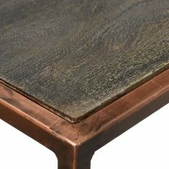 Lend your hallway or living room the Moes Home Collection Bates Console Table for a convenient place to organize your favorite display items or keep some tasteful storage bins. The table has a wide rectangular top and base shelf with a floating half-shelf at mid-height. The frame is built from squared iron and finished in copper. A gray finish accents the solid mango wood surfaces.