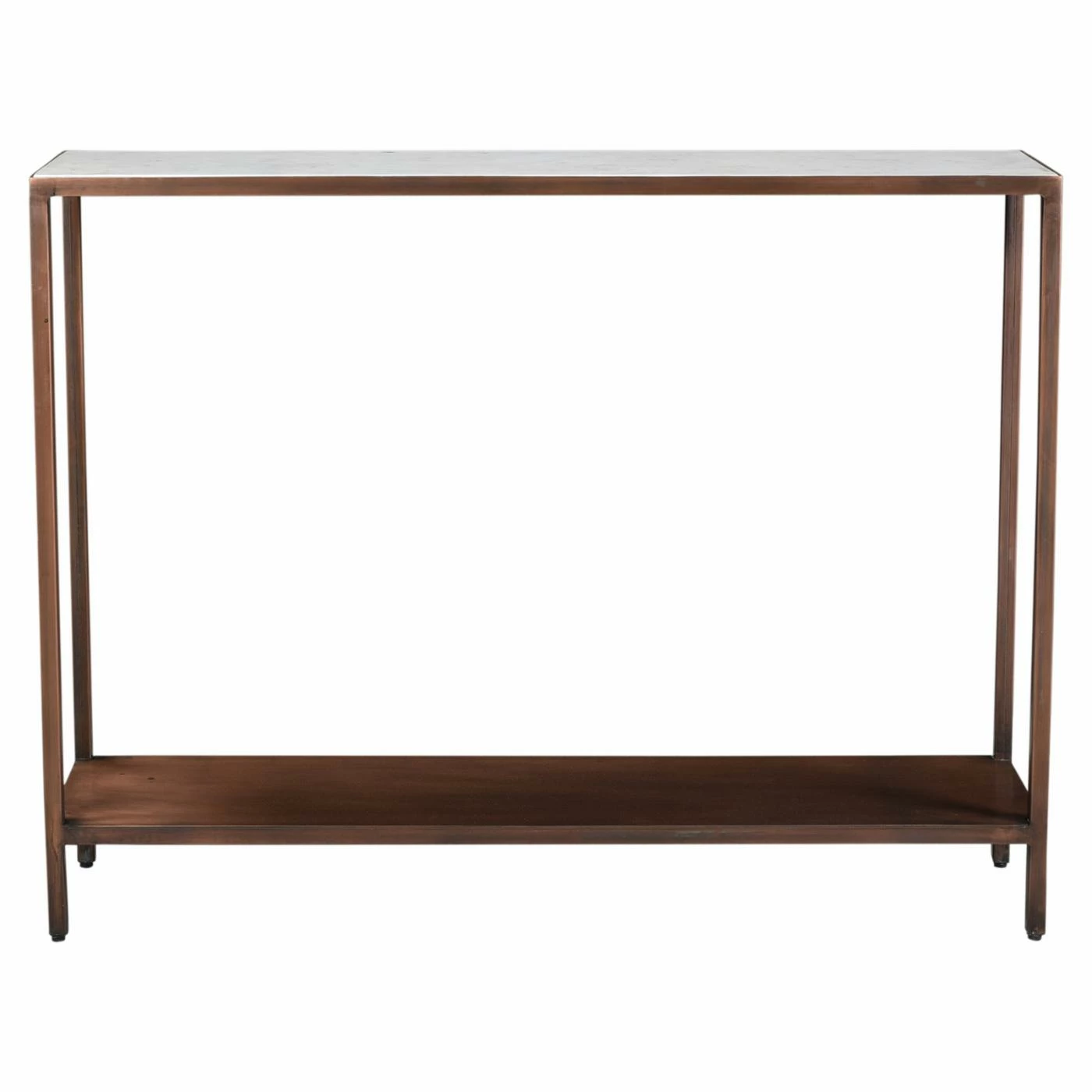 Sharp lines and elegant materials make the Moes Home Collection Bottego Console Table an indispensable complement to your new contemporary living room. Its wide top is made from solid white marble, offering plentiful space for lamps, statues, picture frames, and more. The frame is rendered from iron with squared legs and comes finished in copper. A shelf is built into the base for additional space.