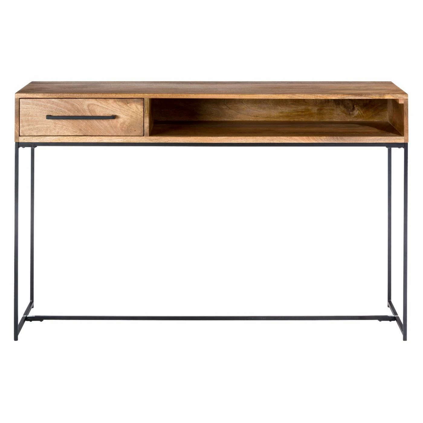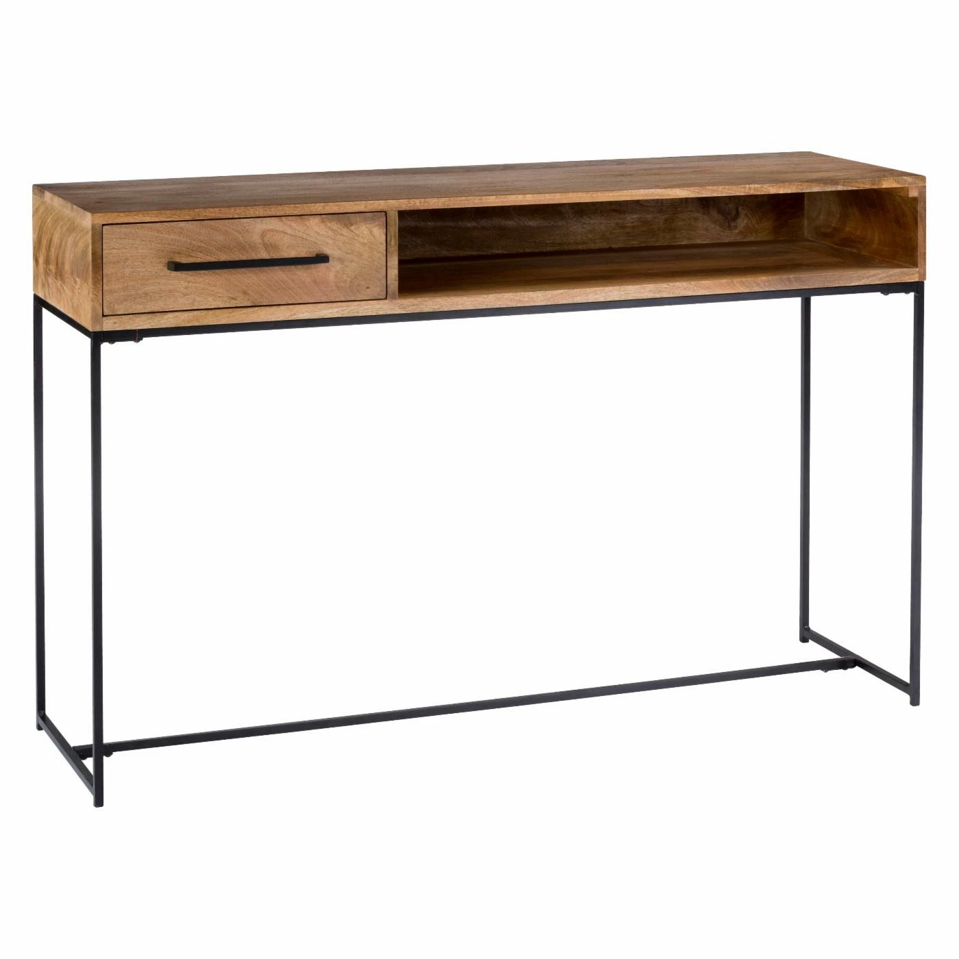Beautiful, stylish, and practical, the Moes Home Collection Colvin Console Table is a work of beauty. Its solid mango top is supported by an iron base which complements the rich, distressed finish. Storage space is provided by the small drawer and open cubby for keeping reading materials and other pieces. Classic and sophisticated, this side table is a gorgeous addition to any home.