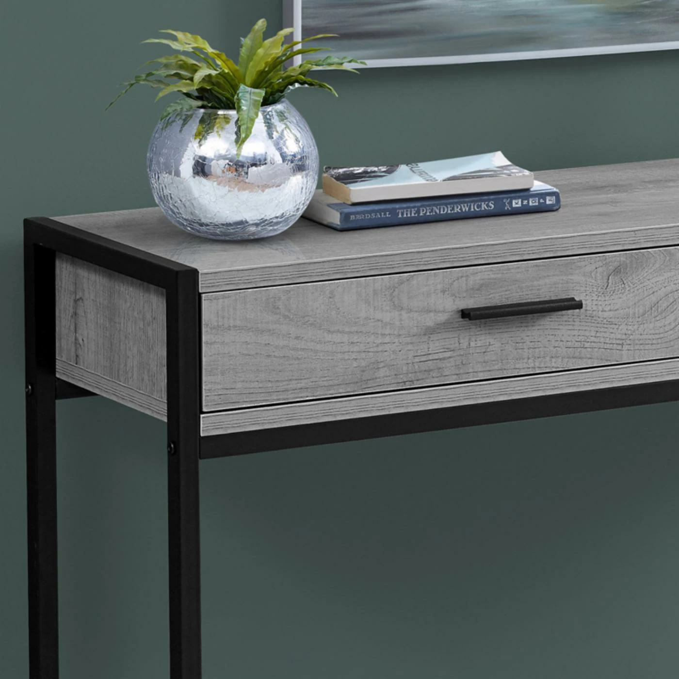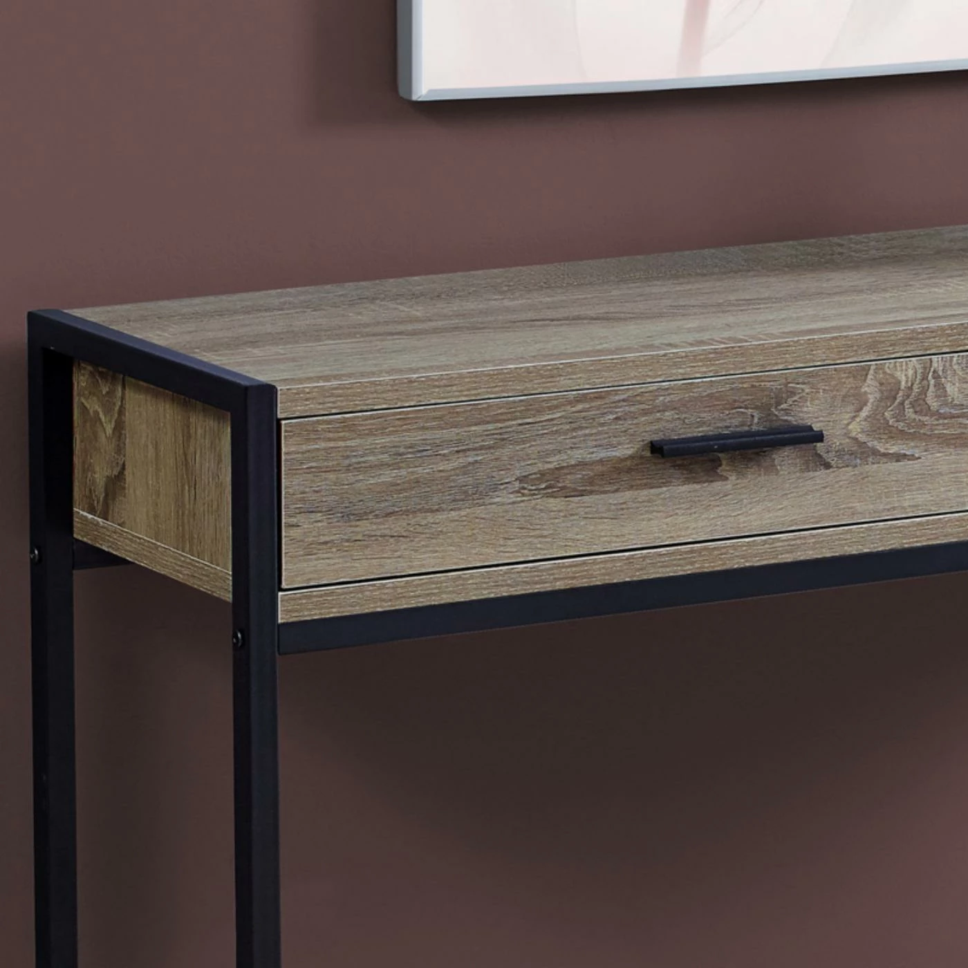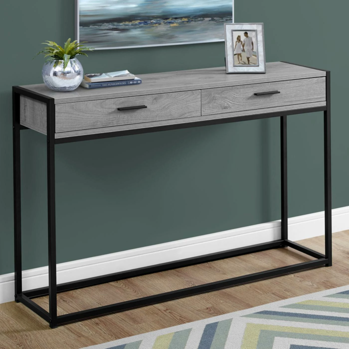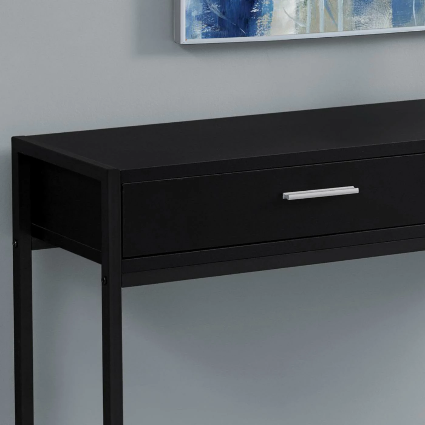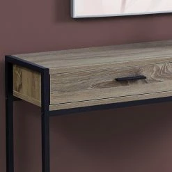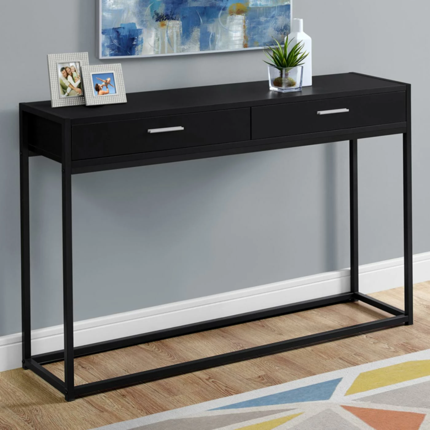 Top the Monarch Specialties Rectangular 2 Drawer Console Table with a few potted plants, a modern table lamp, and hang a sleek mirror above it. This engineered wood console table comes in your choice of available finish and features a sleek, minimalist design. The metal frame and base also comes in your choice of available finish to either match or contrast with the wood. Two drawers offer concealed storage for a variety of smaller items.