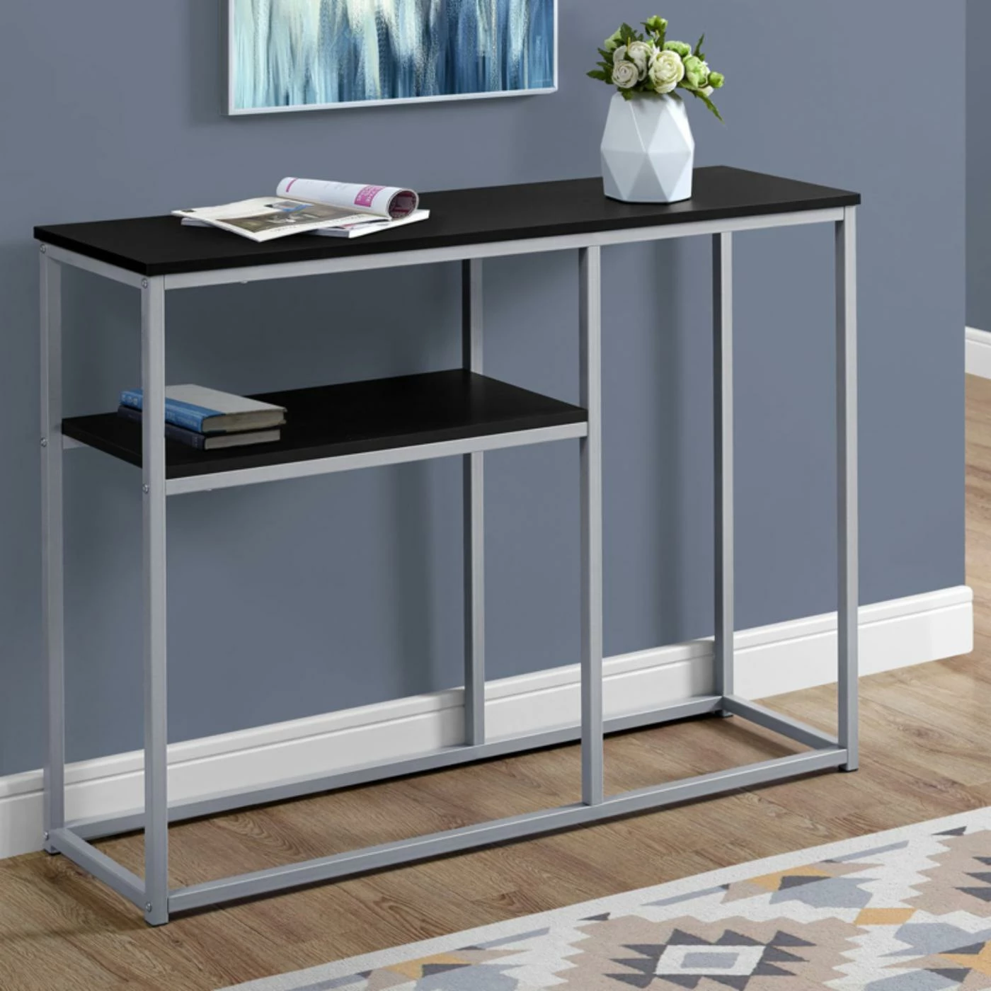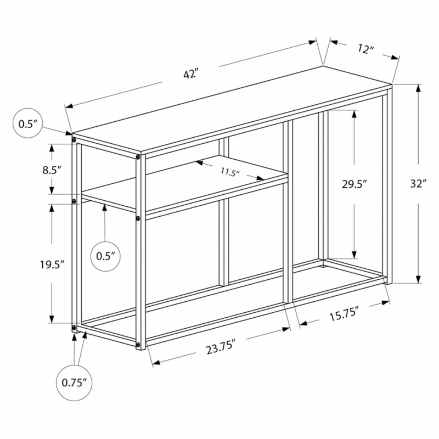 Create a multi-level display in your modern living room or entryway with the Monarch Specialties Rectangular Console Table with Half Shelf. The rectangular top and the half shelf of this console table are made of engineered wood in your choice of available finish. The unique design gives this contemporary piece plenty of dimension with minimalist design. The frame and base of this console table are made of metal and also come in select available finishes to match your taste.