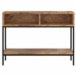 This rustic modern console table has two spacious cubbies that allow for an easy way to store things – display books and magazines, or add a couple of baskets to hold keys and mail. The black wrought iron frame adds a stylish component to this piece while providing sturdy support. The sustainable solid wood table top is finished beautifully in a natural burnt finish, preserving the accentuating features of the mango wood. Great for a casual living space, in a hallway, or entryway.
