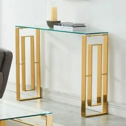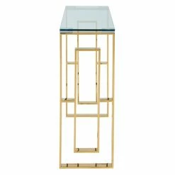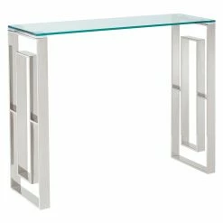 Create a glamorous retreat in your entryway or living room by adding the !nspire Stainless Steel Block Design Console Table. This sleek and narrow console table features a thick tempered glass tabletop. The lattice pattern on the stainless steel legs offers classic styling.