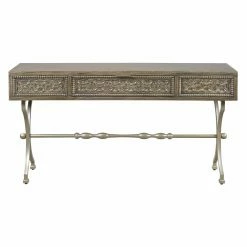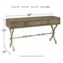 Your entryway will benefit from the graceful, striking design of the Signature Design by Ashley Quinnland Console Table. From its medallion pattern to its sculptural, X-design base, this console table has a penchant for defining a room. Its wood sports an antique gray hue that’s handsomely complemented by the champagne finish of the metal base. One drawer provides you with handy storage space while the spacious top can be home to your favorite decorative pieces.