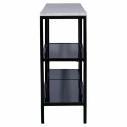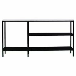 The modern, skinny-mini style of the Southern Enterprises Corman Console Table is going to make the perfect accent for your on-trend space. The frame of the table is made from powder-coated iron with a black finish. The lower shelves are made from shatter-resistant glass, and the wide shelf across the top is crafted from engineered wood. Faux-marble paper veneers give this top shelf a high-end touch with a flowing, dynamic pattern. This console is suitable for anywhere in your home.