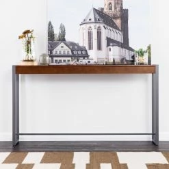 The Southern Enterprises Macen Console Table has a chic simplicity that can land it in your foyer, behind your sofa, or in the dining room. This industrial-inspired piece is made with a frame of metal tube under a powder-coated finish. The simple top is crafted from engineered wood with an exterior of birch veneers. The frame and top are available in a number of different finish combinations, so be sure to take a look and see which one is going become an essential part of your home.