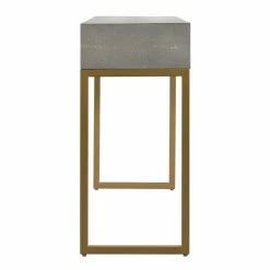- Brass base and hardware with gray vegan rawhide table top