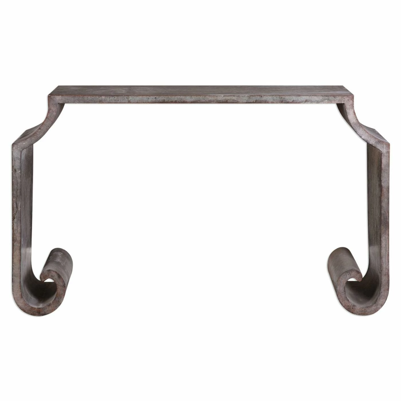 Architectural design meets ancient scrolls in this Uttermost Agathon Console Table. Overscaled scrolls and zinc sheeting construction define this console table. Its heavily oxidized acid wash finish gets an antiqued look from rust bronze and aged stone gray.