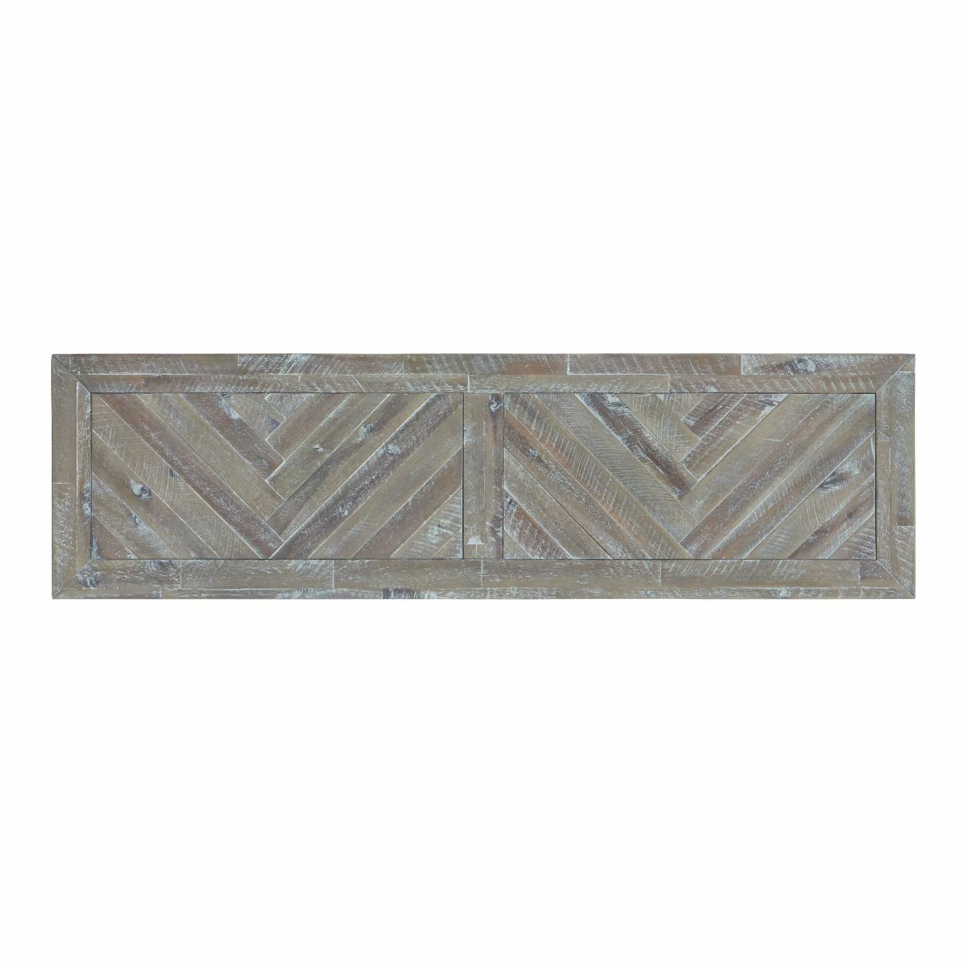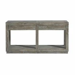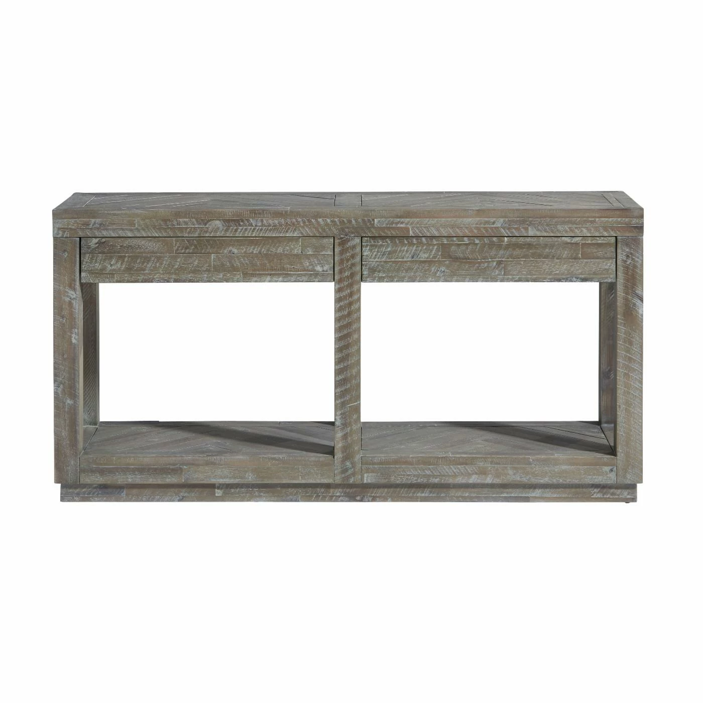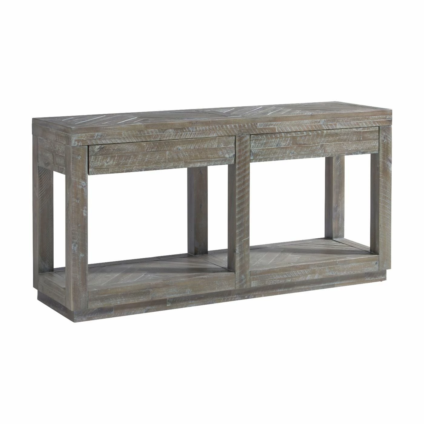 Bring a reclaimed farmhouse style to your dΓ©cor with the Modus Herringbone Solid Wood 2 Drawer Console. The frame is crafted from acacia wood pieces. The tabletop features a herringbone pattern construction. The rustic latte finish was applied using a wire brush, lending to a handmade look. For storage, tow drawers and a lower open shelf provide adequate space.