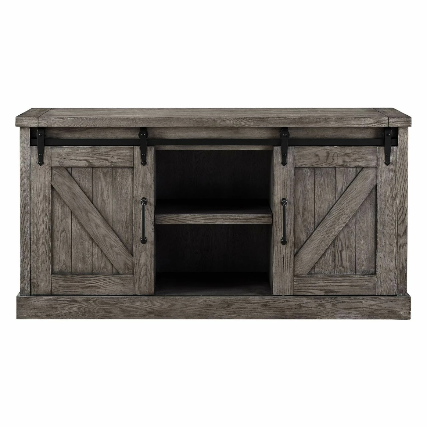 Outfit your new living room or den with the Martin Home Furnishings Bailey 60 in. TV Stand for a spacious complement to your modern TV. The frame of this TV stand is constructed from durable wood planks and outfitted with iron hardware. A center two-shelf console area lets you easily add accessories and electronics for easy access. Two side cabinets are incorporate into the design, each outfitted with top-mounted barn-door rails, an interior shelf, and a framed, diagonal barn-door look. A rustic gray finish tops the wood.