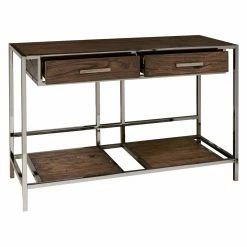 Enjoy some contemporary-style storage in your living room or bedroom with the Right2Home Smoked Metal Sofa Table. This handsome sofa table is a perfect fit for any mid-century or modern decors. Squared metal supports the open frame, finished in a polished smoked color. For storage, two drawers are incorporated into the face, outfitted with bar handles. Two lower shelves rest near the base. The top, drawer faces, and shelves are crafted from thick wood with a dark brown veneer finish.