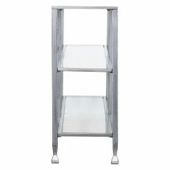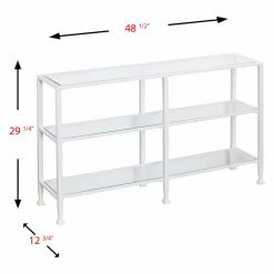For chic versatility, this Southern Enterprises Jaymes Metal / Glass 3-Tier Console Table/Media Stand has a wide yet slim design that fit well in a hall, behind your sofa, or in the entryway. This console table is built with a slim iron frame in your choice of available powder-coated finish colors. To ensure you have plenty of display space and an open look, the table offers a tempered glass top and two shelves.