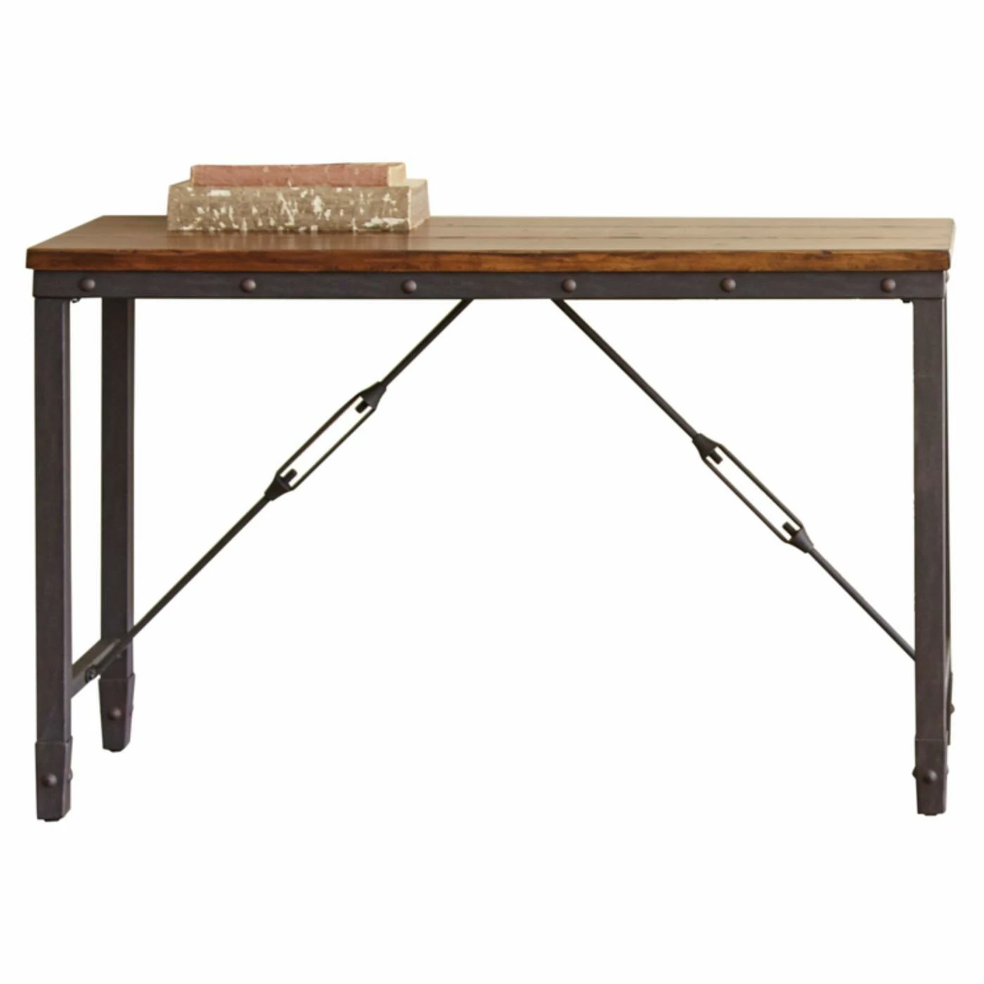 The tall and slender Steve Silver Co Ashford Sofa Table is perfectly scaled to add rugged industrial style and practicality to your sofa, entryway, or hall. It features a physically distressed plank effect top built from pine solids and veneers in an antiqued honey finish. This sofa table stands on a strong iron base in an industrial gray finish accented with cable stretchers and rivet details.